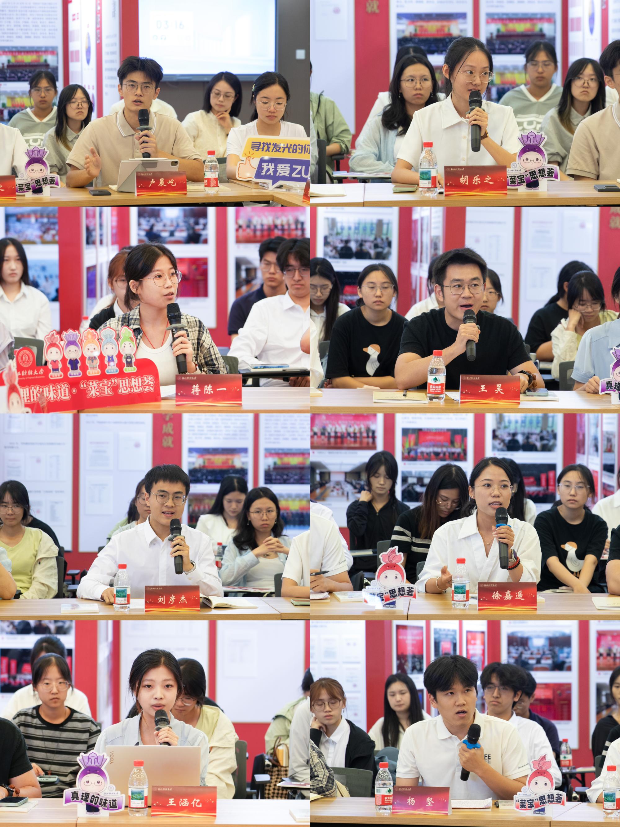 互动研讨环节,现场师生热情高涨、踊跃发言,思维的火花在交流中不断迸发。他们围绕“文化与经济的关系”“数字化时代如何传承文化”“青年一代的斗争精神”等议题踊跃发言。有的同学结合暑期实习经历,提出“文化是经济发展的灵魂”,认为良渚文化中的工匠精神、生态理念与高质量发展需求高度契合;有的同学分享井冈山红色实践感悟,呼吁以革命文化为滋养,筑牢理想信念之基。此外,同学们还就元宇宙技术应用于文化遗产展示、短视频传播中国故事等创新路径展开讨论,提出将浙财精神融入校园文化建设、以学生视角阐释传统文化的具体思路。
