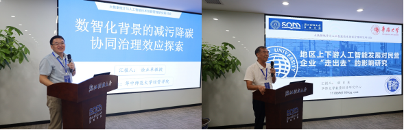 华中师范大学经济与管理学院院长涂正革教授分享了“大数据赋能减污降碳协同治理:理论逻辑、实践路径与案例验证”。他指出面对污染源复杂多样、分散难控的挑战,数智化治理上在政策监测排放上已经取得较好成效,未来必须探索更多应用的治理场景,尤其是对数智化绿色生产的赋能,带动源头生产中的减污降碳协同效应。华侨大学胡日东教授围绕“地区上下游人工智能发展对民营企业‘走出去’的影响研究”进行报告。他提出“地区上下游人工智能发展是否影响以及如何影响民营企业‘走出去’?存在怎样的差异化效应和演变规律?”等议题。他的研究发现下游AI发展显著促进民营企业“走出去”,而上游AI发展的影响相对较弱,证实了AI产业发展存在明显的方向性差异,提出适度加大对下游AI应用生态的资源倾斜,设立"数字贸易服务基金",建设国际化AI应用场景库,同时预留上下游协同创新的发展空间。