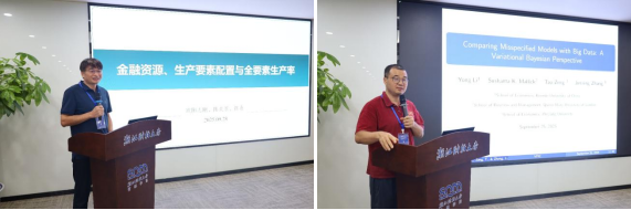 华东交通大学副校长欧阳志刚教授分享了主题为“金融资源、生产要素配置与全要素生产率”的学术报告。生产要素创新性配置是发展新质生产力、推动经济高质量发展的一个重要渠道,研究构建了一个包括融资部门金融资源配置和生产部门生产要素配置的理论分析框架,并基于中国企业中间投入占比较高的现状,在考虑实物资本和劳动两种生产要素的基础上进一步引入了中间投入,系统地测算并分析了不同类型的金融资源配置对各种生产要素配置及全要素生产率的影响。中国人民大学李勇教授分享了“基于大数据的贝叶斯统计推断研究进展及其应用”。研究针对海量数据下模型设定偏差的模型比较问题,提出两种新的基于惩罚的预测信息准则:先借助变分贝叶斯后验分布,从预测视角推导出变分插入预测分布和变分后验预测分布两类预测分布,接着研究了与这两类分布相关、以数据生成过程和预测分布间KL散度期望定义的风险函数,在特定正则条件下证明所提信息准则是各自风险函数的渐近无偏估计量,最后验证了其在海量数据模型设定偏差场景下模型比较的性能。