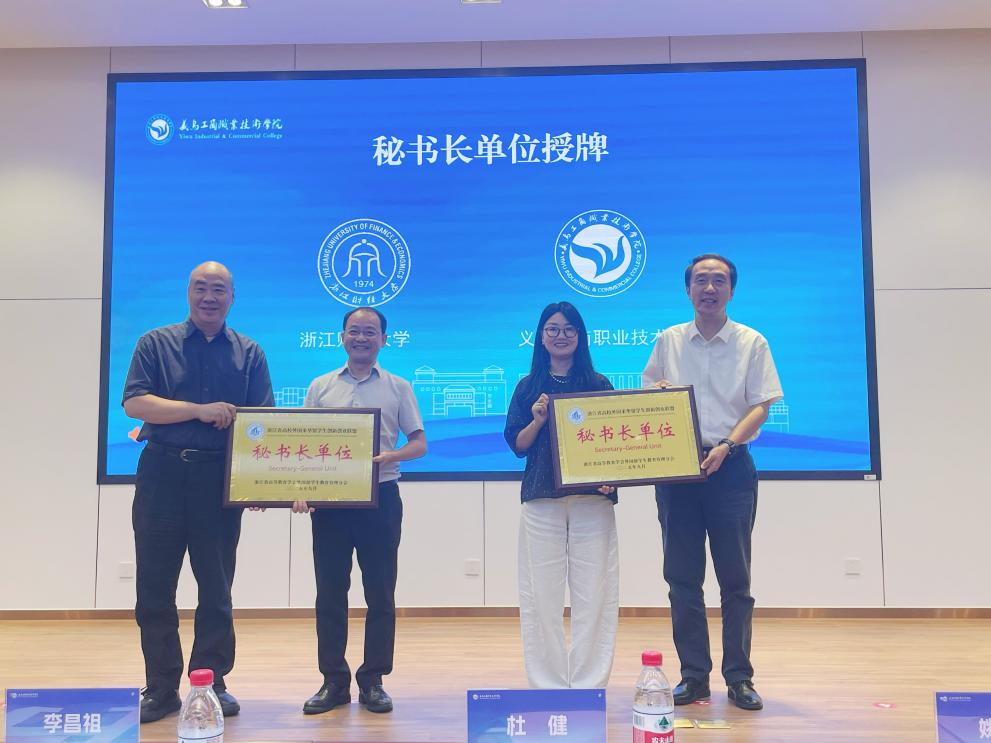 会上,浙江省教育厅国际处一级调研员杜健为学校颁发“浙江省高校外国来华留学生创新创业联盟秘书长单位” 牌匾。