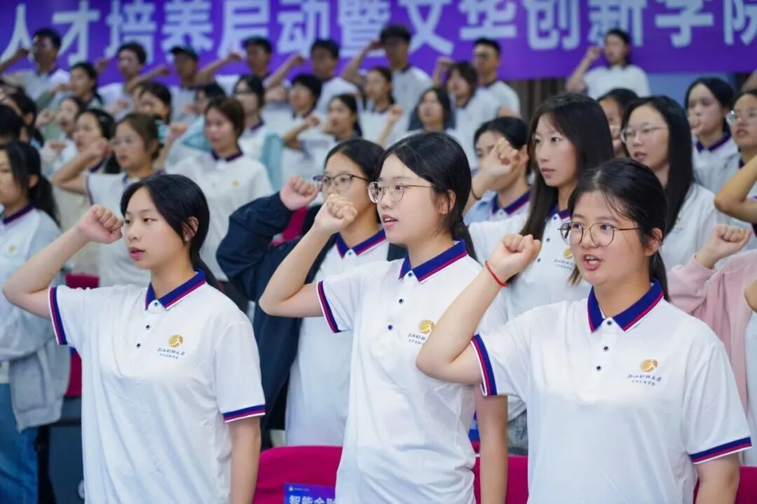 全体新生庄重佩戴文华创新学院院徽,并面向院旗庄严宣誓:“明德笃学、抱朴守真,崇实创新、经世济民……成‘完全之人物’,写无悔之青春!”铿锵誓言回荡全场,彰显出新文华人的使命与担当。