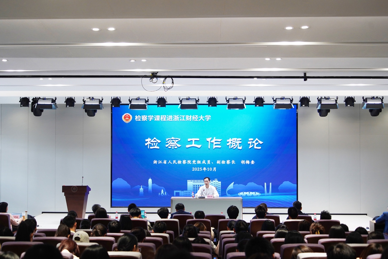 本网讯 10月23日,浙江省人民检察院党组成员、副检察长、一级高级检察官胡梅奎走进校园,为我校师生讲授“检察工作概论”。讲座由副校长李占荣主持。