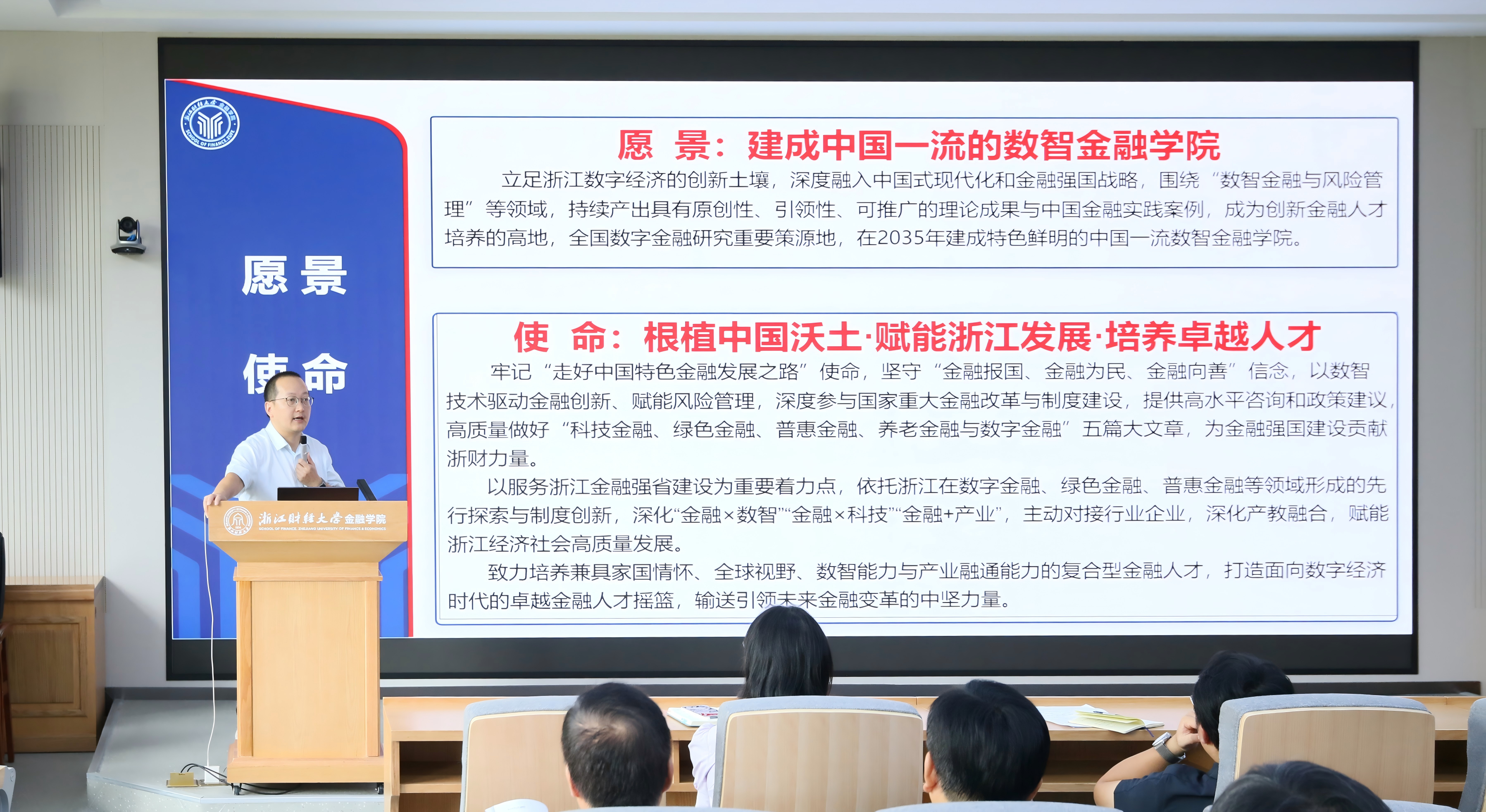 在广泛征集、深入研讨的基础上,金融学院明确了发展愿景,即:建成中国一流的数智金融学院。学院将立足浙江数字经济的创新土壤,深度融入中国式现代化和金融强国战略,围绕“数智金融与风险管理”等领域,持续产出具有原创性、引领性、可推广的理论成果与中国金融实践案例,成为创新金融人才培养的高地,全国数字金融研究重要策源地,在2035年建成特色鲜明的中国一流数智金融学院。也明晰了学院的办学使命,即:根植中国沃土·赋能浙江发展·培养卓越人才。学院将遵循“走好中国特色金融发展之路”指引,坚守“金融报国、金融为民、金融向善”信念,以数智技术驱动金融创新、赋能风险管理,深度参与国家重大金融改革与制度建设,提供高水平咨询和政策建议,高质量做好科技金融、绿色金融、普惠金融、养老金融与数字金融“五篇大文章”,为金融强国建设贡献浙财力量。以服务浙江金融强省建设为重要着力点,依托浙江在数字金融、绿色金融、普惠金融等领域形成的先行探索与制度创新,深化“金融×数智”“金融×科技”“金融+产业”,主动对接行业企业,深化产教融合,赋能浙江经济社会高质量发展。致力培养兼具家国情怀、全球视野、数智能力与产业融通能力的复合型金融人才,打造面向数字经济时代的卓越金融人才摇篮,输送引领未来金融变革的中坚力量。
