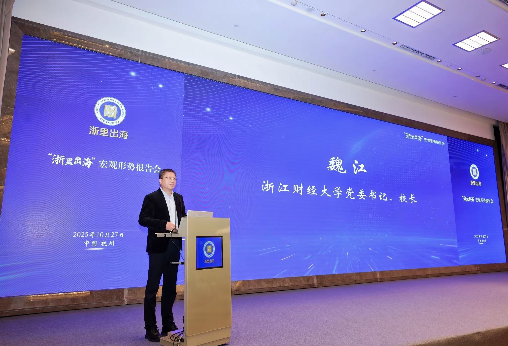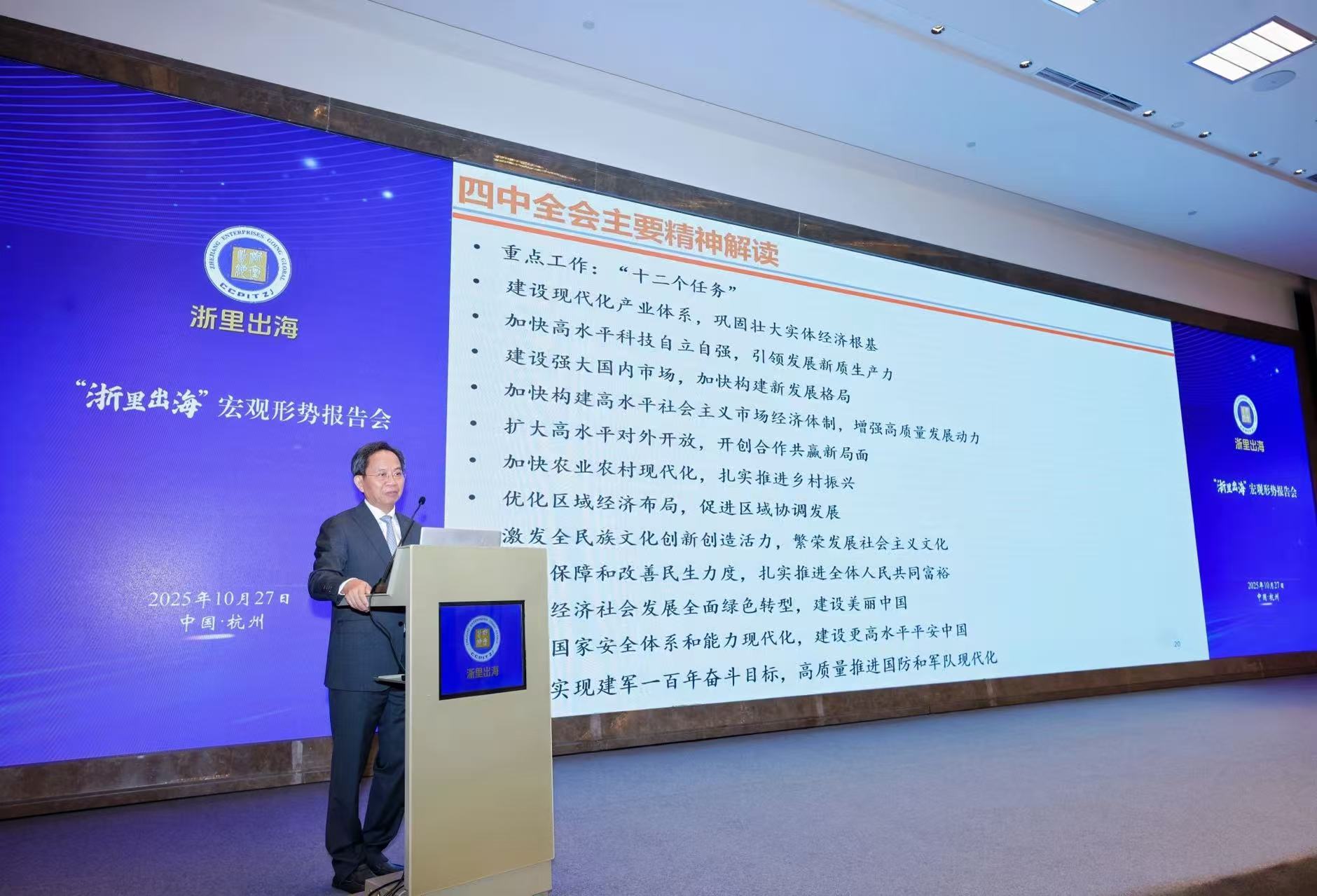 本网讯 10月27日,由浙江省贸促会与我校联合主办的第三期“浙里出海”宏观形势报告会在西子湖畔举行。本次报告会以“观全球变局,谋浙里新篇”为主题,旨在深入学习贯彻二十届四中全会精神,助力浙江企业精准把握“十五五”发展新阶段的核心要求,共同谋划高质量发展新蓝图。