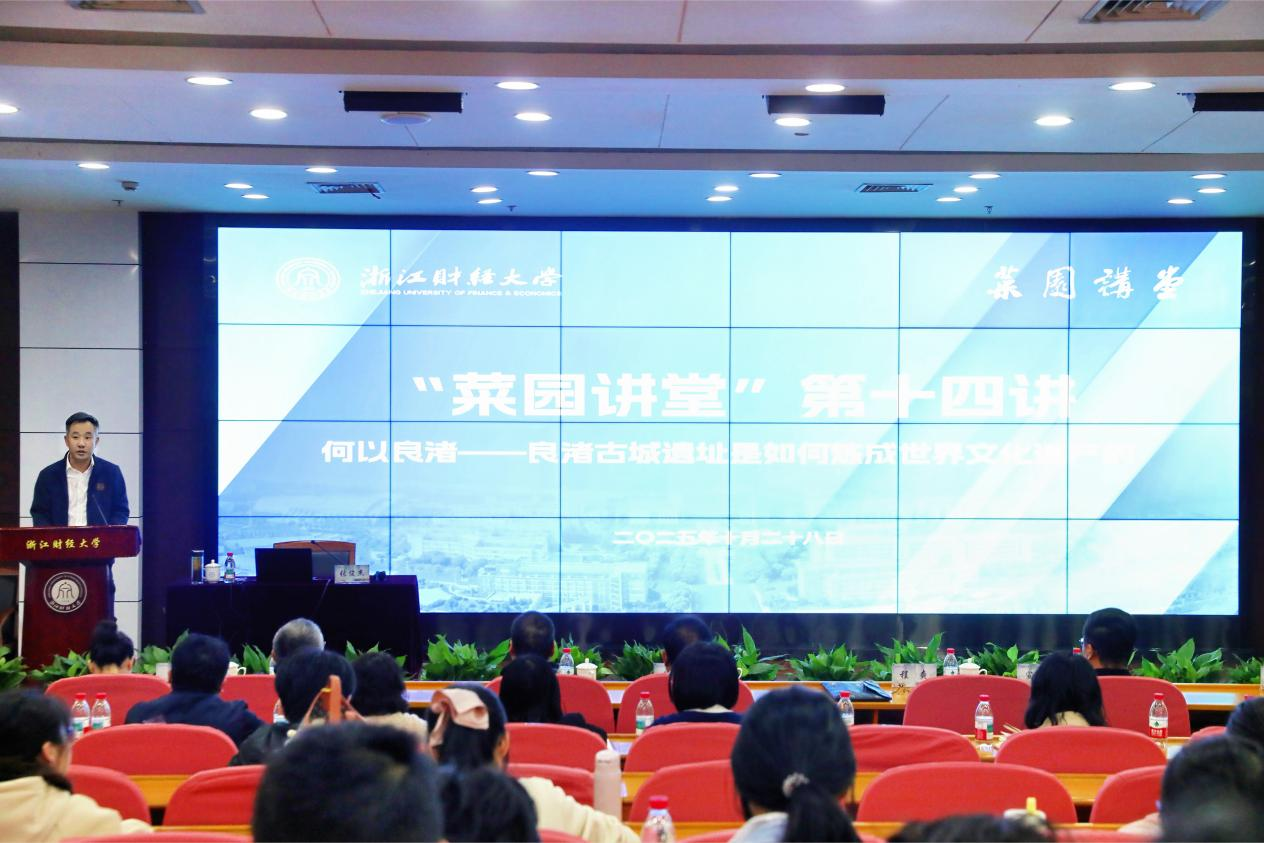 程爽在主持时表示,张俊杰先生以深厚的专业素养和丰富的实践经验,系统梳理了良渚古城遗址从考古发现到成功列入《世界遗产名录》的全过程,深入阐释了良渚文明的历史价值与文化意义,让我们深刻感受到一代代守护者、建设者的责任与情怀。程爽强调,学校举办“菜园讲堂”,通过一系列人文、科技与思想的交流碰撞,帮助大家在追求专业精进的同时,涵养人文情怀,拓展精神疆界,成长为兼具科学精神与人文素养的“完全之人物”。他鼓励同学们通过今天的讲座,能够更加关注中华优秀传统文化的保护与传承,树立文化自信,增强民族认同,以实际行动讲好中国故事,传播中国声音。