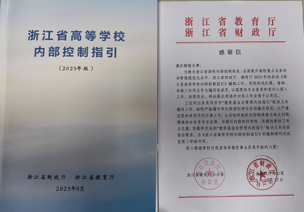本网讯 10月30日,《浙江省高等学校内部控制指引(2025年版)》发布会在杭举行。会上,浙江省教育厅、浙江省财政厅向我校发来感谢信,对我校审计处祝红霞、翁琦、朱琳三位同志参与《浙江省高等学校内部控制指引(2025年版)》编写工作的突出表现予以高度赞扬和肯定。