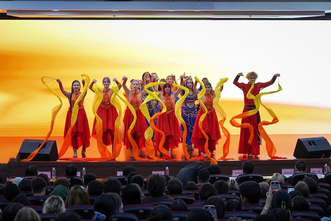 典礼上,文艺表演环节精彩纷呈,不仅有多元文化的展示,更有时尚活力的迸发。中国传统舞蹈《金蛇狂舞》点燃了现场气氛,歌曲联唱《肆意的河》与《推开世界的门》,歌声悠扬,情感真挚。国际学生街舞社“ONE” DANCE CLUB带来的街舞《WICKED》则动感十足,将现场气氛推向高潮,展现了国际学生蓬勃的朝气与活力。典礼在合唱《明天会更好》中步入尾声,歌声中饱含着对未来的美好祝愿,为整场活动画上了圆满的句号。