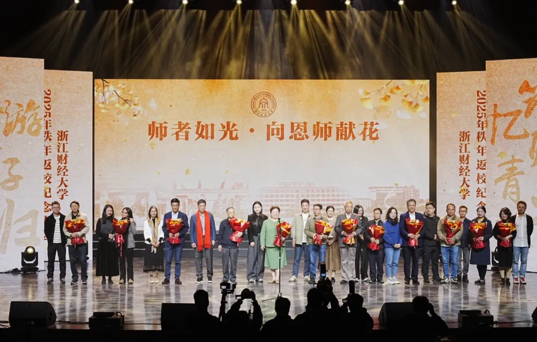 诗朗诵《以浙财之名》在温情的氛围中登场。1985届罗国芳、1995届姚臻、2005届高佳敏、2015届毛瑜华与18名学生代表并肩而立,共同发出“以‘浙财’之名,承初心之诺,赴未来之约”的铿锵誓言。当饱含深情的念白因激动而微微颤抖,这场跨越四十年的声音接力在娓娓道来中点燃全场的热情。
