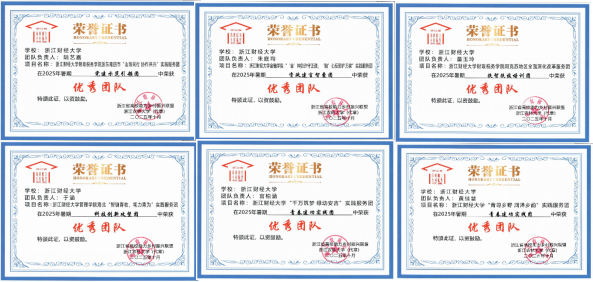 财税学院赴浙东南四市“山海同行 协作共兴”实践服务团深入苍南、缙云等浙江省山海协作工程示范地,深入了解基层组织的示范引领作用,获“党建示范引领团优秀团队”。金融学院赴杭州“‘金’钟防诈守正道,‘融’心反邪护万家”实践服务团深入基层社区,围绕“反诈反邪”主题,联合基层组织为当地反诈反邪工作建言献策,获“咨政建言智囊团优秀团队”。财税学院阿克苏地区全面深化改革服务团依托“财政金融智库”,落实培训服务,深化校地长效合作,获“扶智扶技培训团优秀团队”。管理学院赴海北“智链青牧,牦力青为”实践服务团聚焦青海祁连县牦牛产业现代化升级,融合民族团结与技术赋能双重主题,获“科技创新攻坚团优秀团队”。管理学院“青寻乡野 润泽乡韵”实践服务团携手昆阳镇政府,通过实地走访与深度访谈等多元方法,寻求青年与乡村双向赋能的新模式,获“青春建功实践团优秀团队”。管理学院“千万筑梦,绿动安吉”实践服务团赴安吉天子湖镇调研生态发展、基层治理模式,总结“两山”转化经验,助力乡村振兴,获“青春建功实践团优秀团队”。