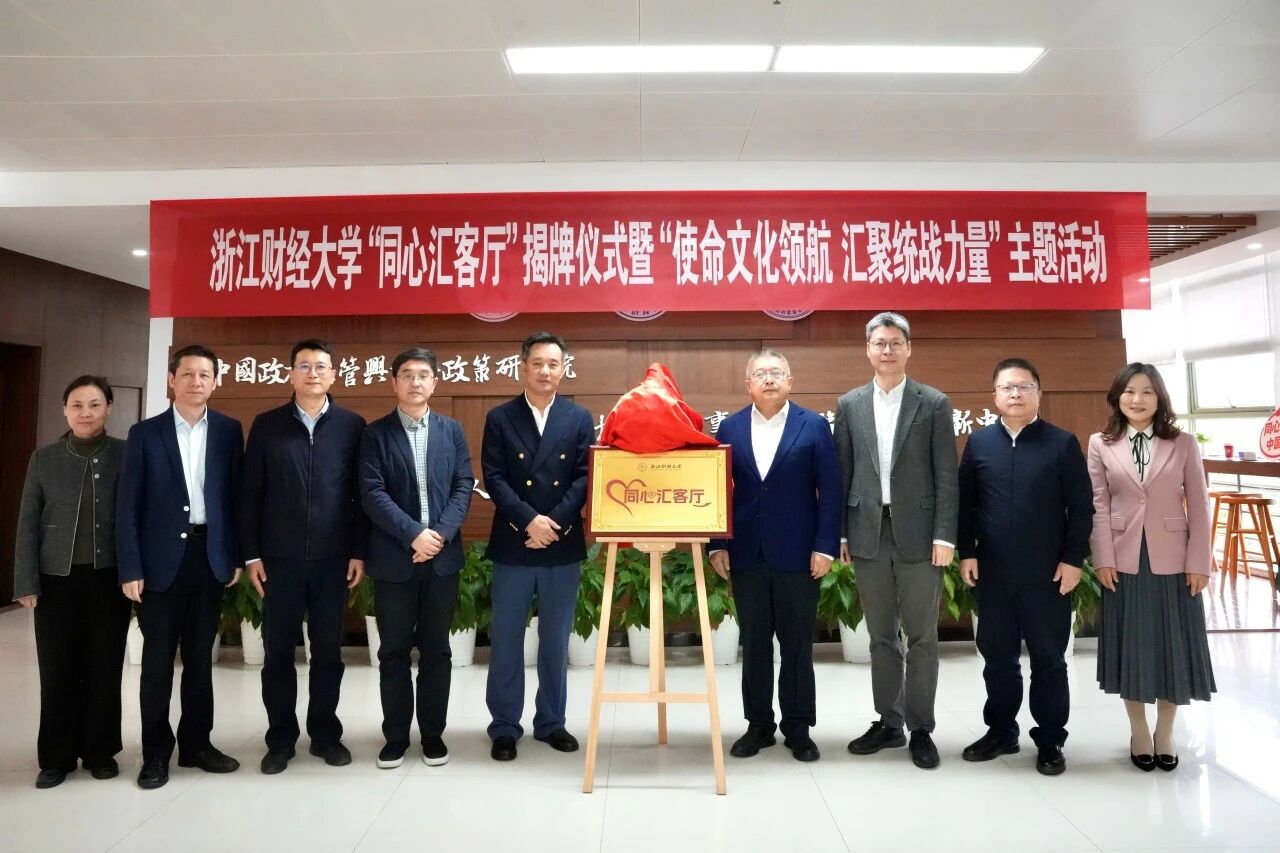 本网讯 为深入学习贯彻党的二十届四中全会精神,凝心聚力推动学校高质量发展,11月11日,浙江财经大学“同心汇客厅”揭牌仪式暨“使命文化领航 汇聚统战力量”主题活动举行。各民主党派、统战团体和职能部门代表齐聚一堂,共话使命文化,共绘发展蓝图。校党委副书记、统战部部长程爽出席活动。