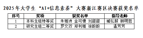 本网讯 11月15日浙江省大学生“AI+信息素养”大赛暨2025 年大学生“AI+信息素养”大赛浙江赛区决赛圆满落幕。我校代表队表现优异,荣获特等奖1项、二等奖1项,学校获“优秀组织奖”,图书馆温芳芳、顾明哲、臧弘毅三位老师获“优秀指导教师”称号。荣获特等奖的本科生队伍“从容应队”成功晋级全国联赛,成为全省获此资格的两支本科生队伍之一。