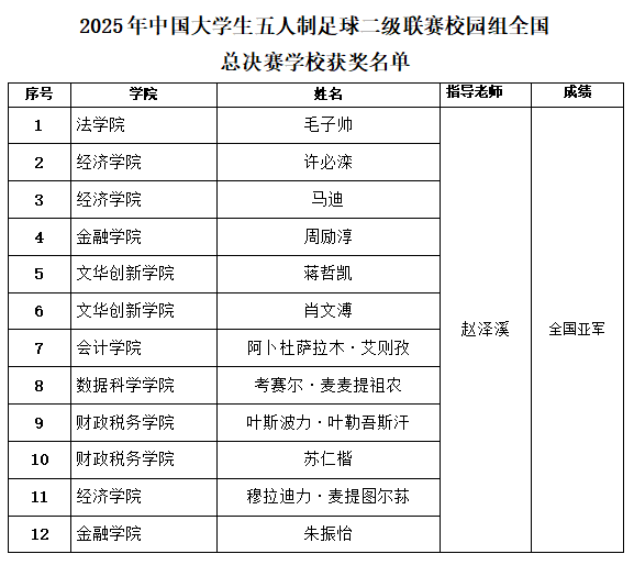 本网讯 11月12日至19日,2025年中国大学生五人制足球二级联赛校园组全国总决赛在宜宾市举行。我校运动健儿一路过关斩将,勇夺全国亚军,取得历史最好成绩。