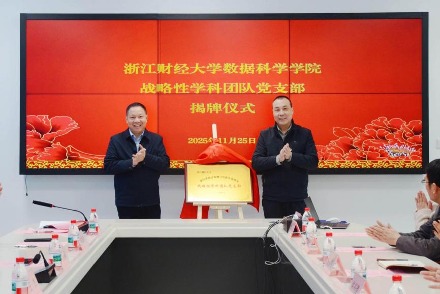 本网讯 11月25日,学校数据科学学院新经济统计监测与智能决策研究团队党支部揭牌暨党建共建签约仪式在校图书馆举行。浙江省统计学会会长王杰,校发展委员会主席、团队党支部书记李金昌,校党委副书记程爽,校党委委员、组织部部长申屠莉,省统计局研发中心主任周琳等出席活动。