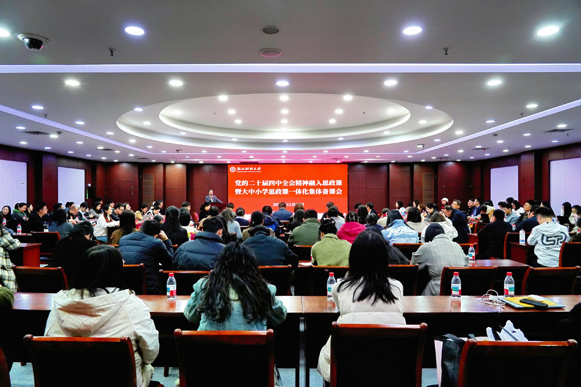 本网讯 为深入学习贯彻党的二十届四中全会精神,切实把全会精神有机融入思政课教学全过程,构建大中小学思政课一体化育人体系,11月25日,学校召开党的二十届四中全会精神融入思政课集体备课会。校党委书记、校长魏江出席会议并讲话,校党委委员、副校长董进才,校党委副书记程爽,宣传部、教务处负责人,校督导代表,马克思主义学院全体教师、辅导员以及钱塘区中小学教师代表参加备课会。