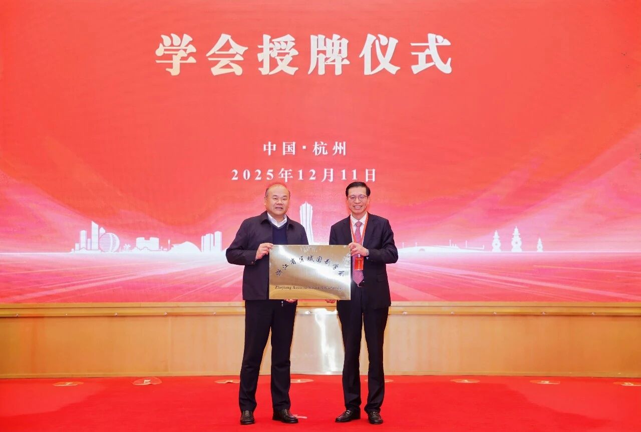 浙江省社科联徐健副主席向学会当选会长郭华巍授牌。