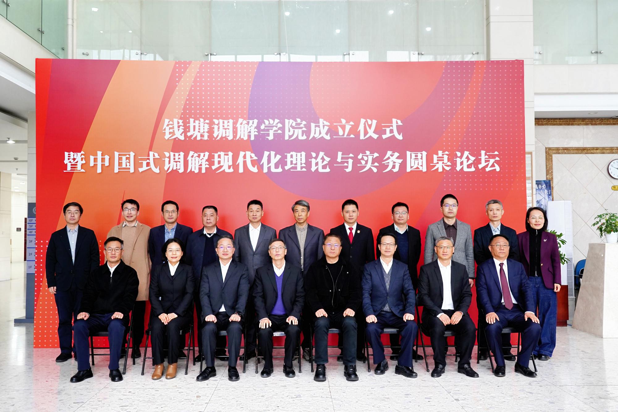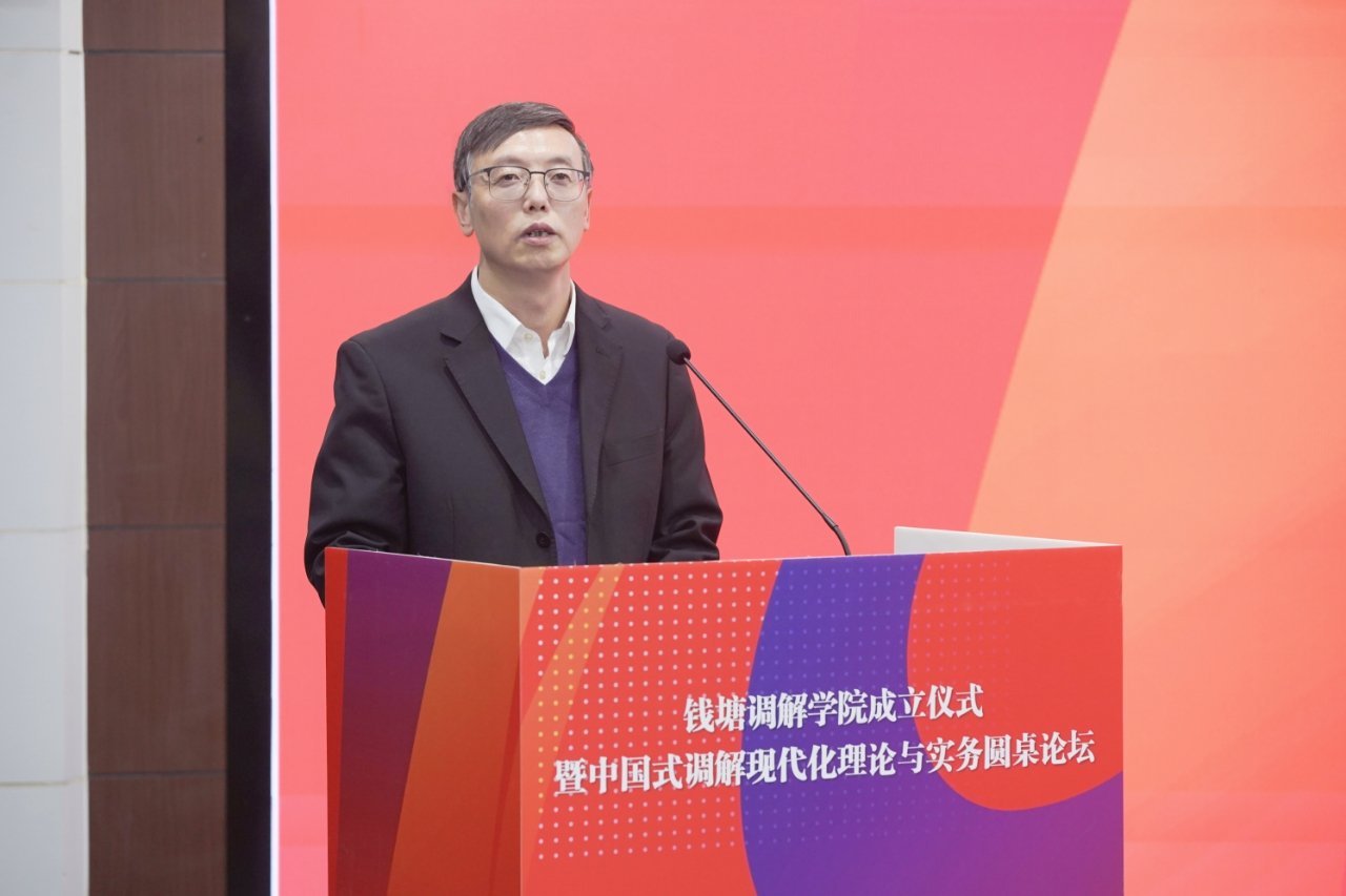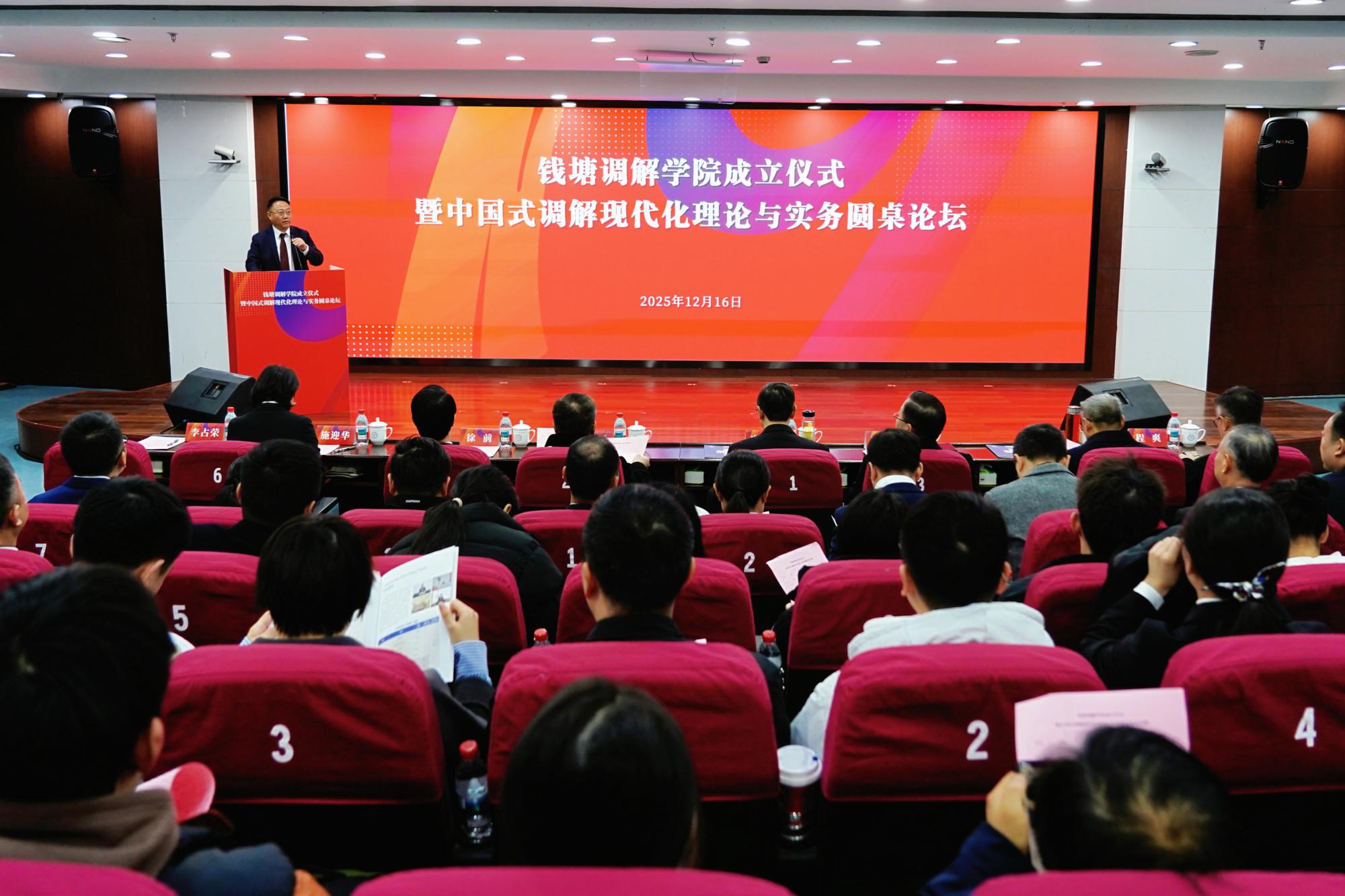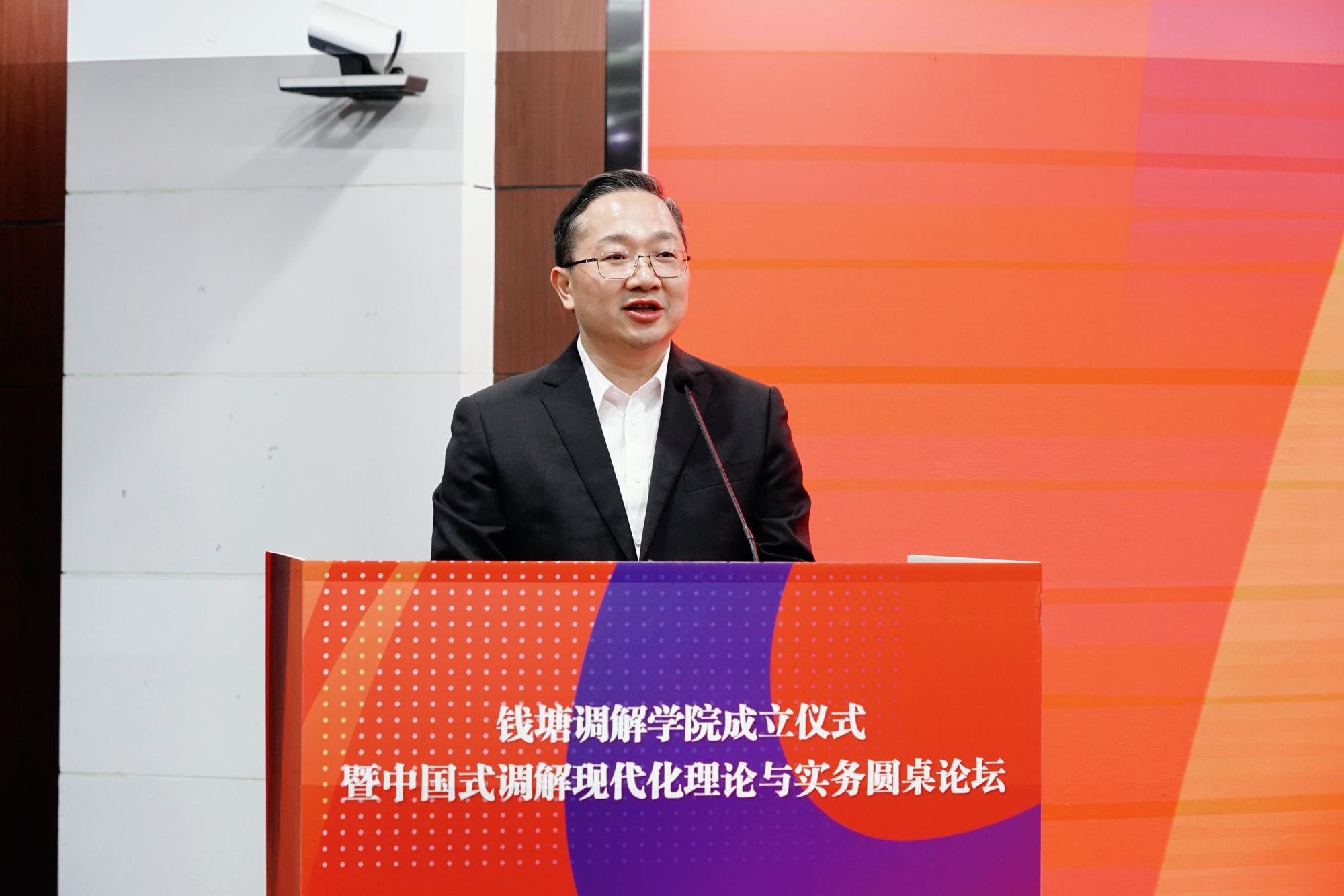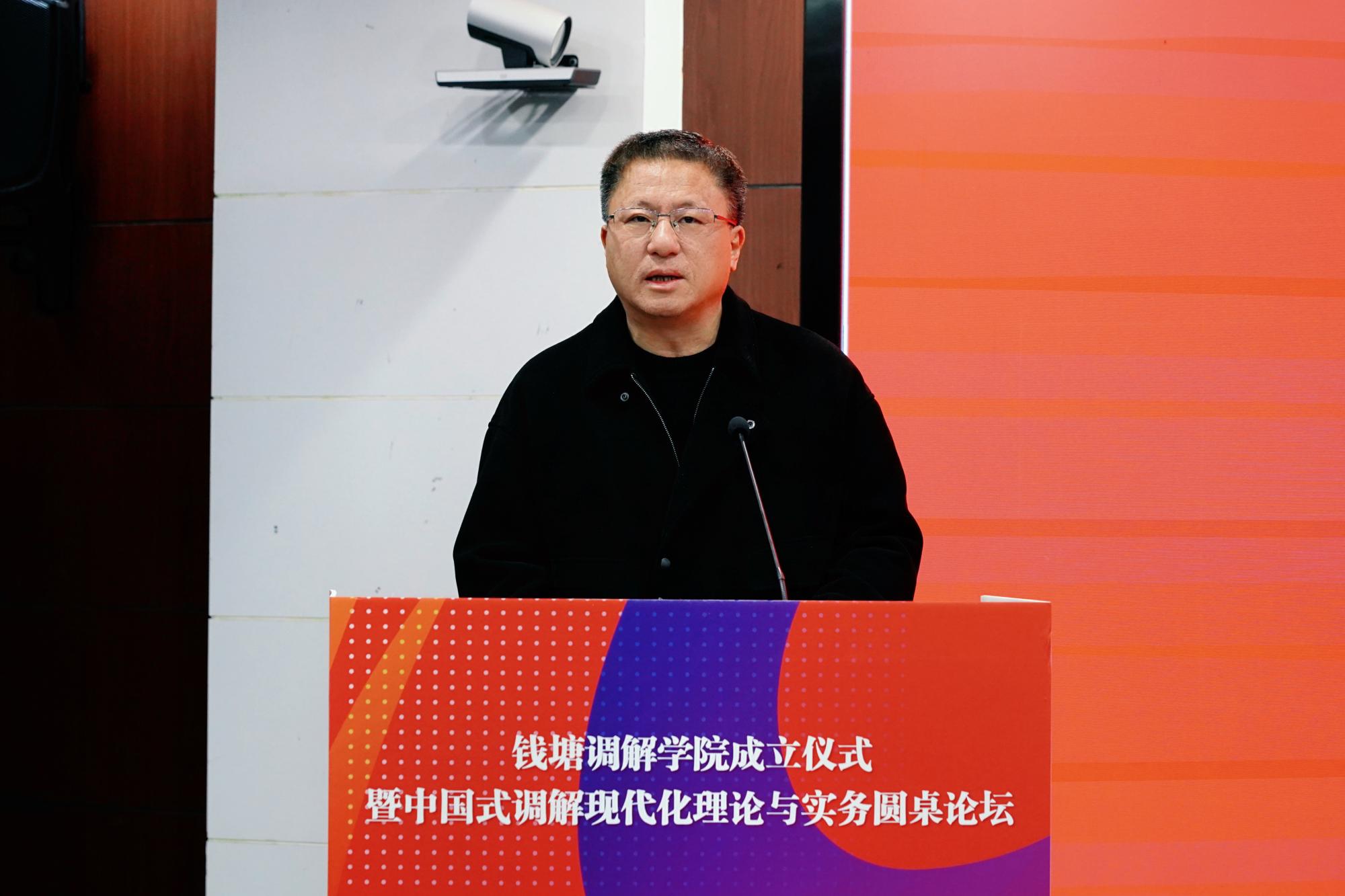 本网讯 12月16日,钱塘调解学院成立仪式暨中国式调解现代化理论与实务圆桌论坛在学校下沙校区举行。杭州市中级人民法院党组书记、院长唐学兵,校党委书记、校长魏江,钱塘新区党工委书记、钱塘区委书记沈燕俊出席并致辞。杭州市司法局党委书记、局长徐前,副校长李占荣,校党委副书记、统战部部长程爽,钱塘区委常委、组织部部长李丰,钱塘区人民法院党组书记、院长施迎华出席论坛。