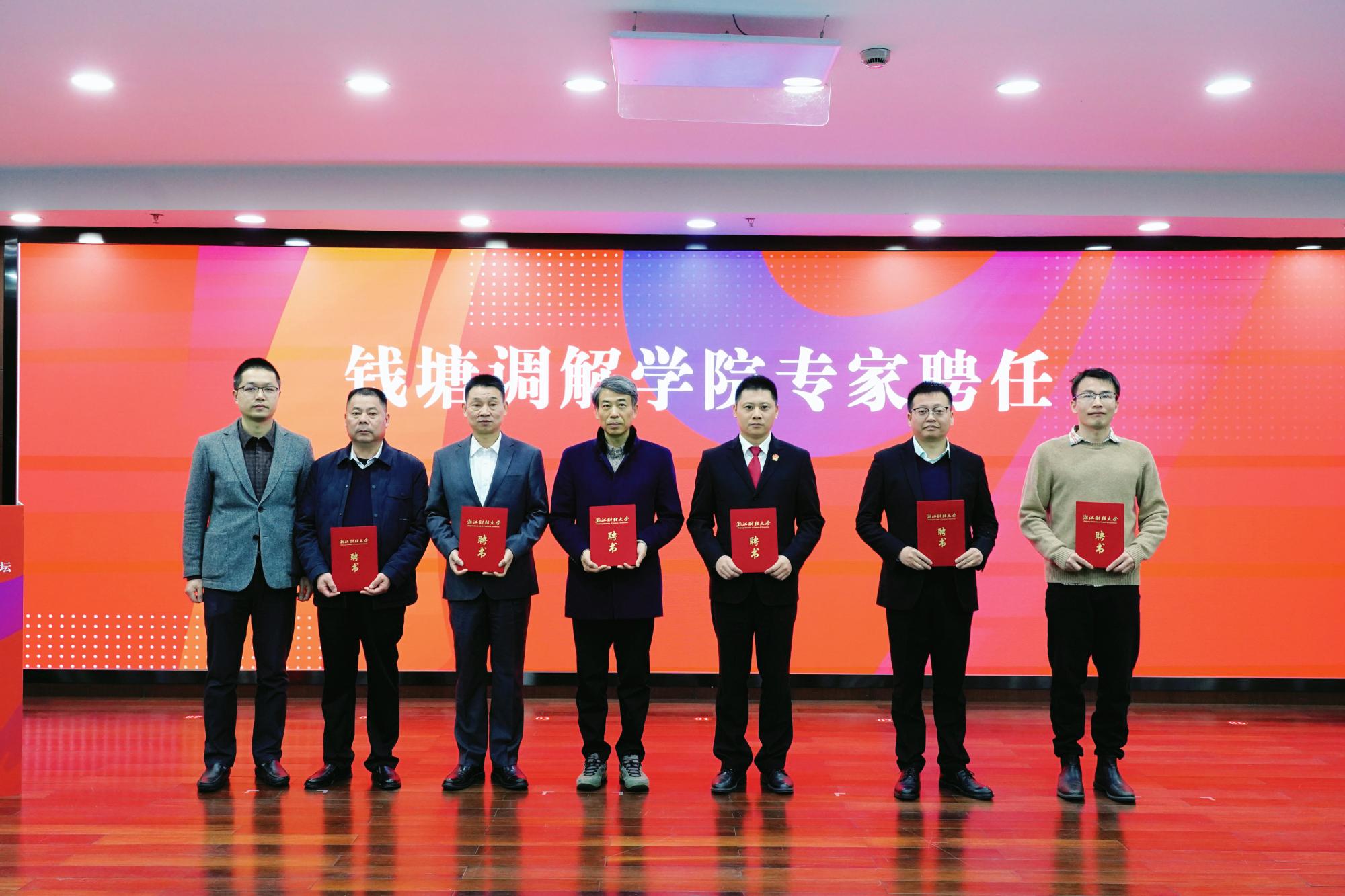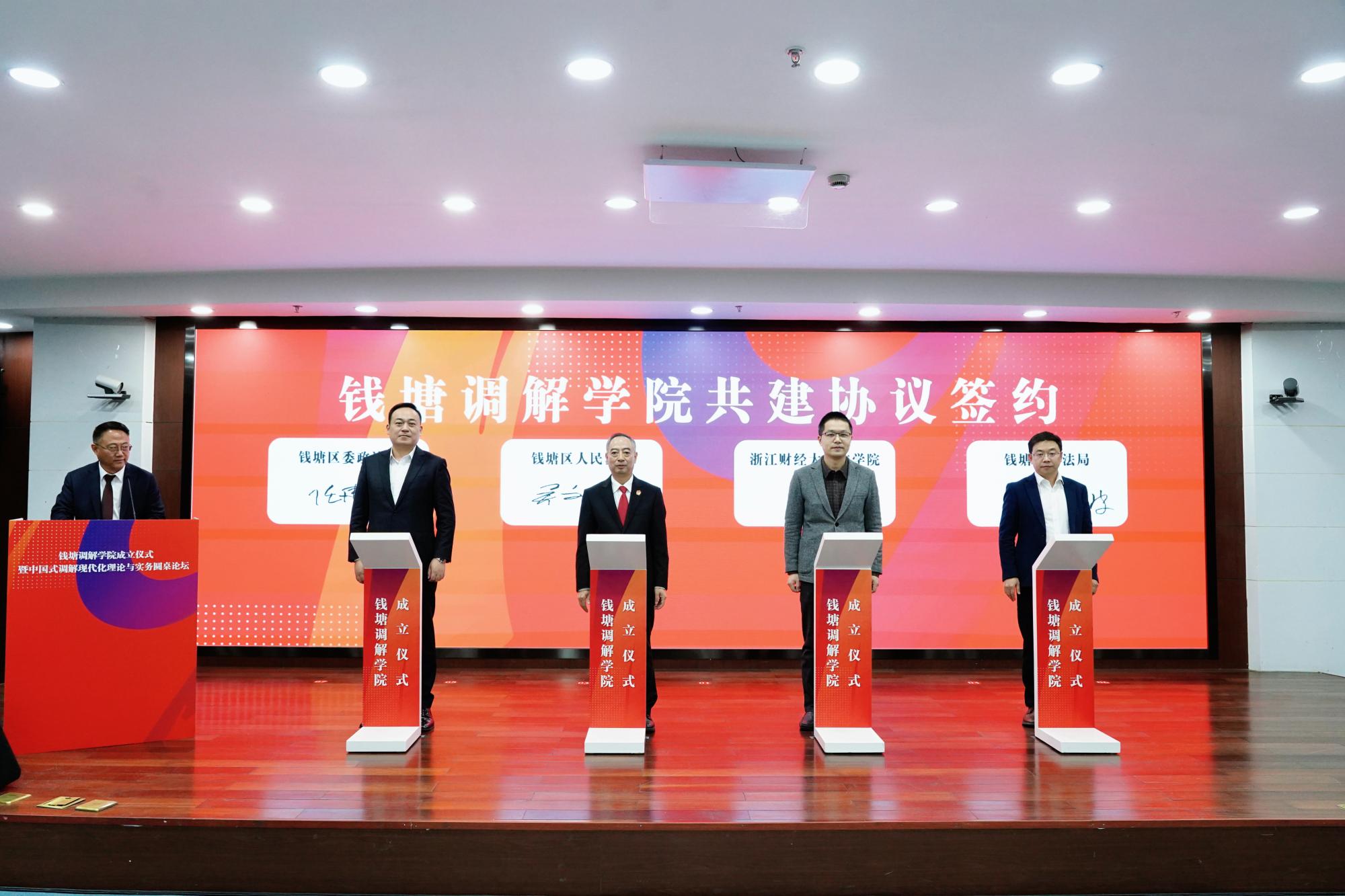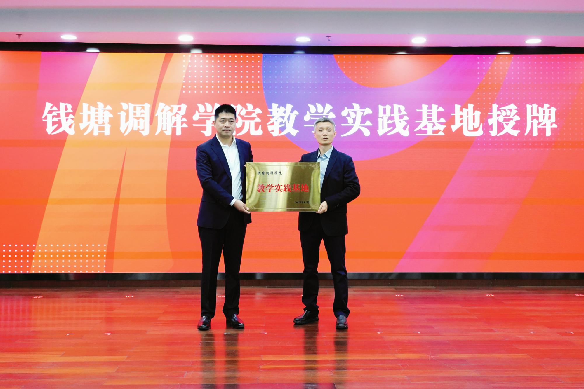 活动现场,钱塘区委政法委、区法院、区司法局、浙江财经大学法学院签署钱塘调解学院共建协议。唐学兵、魏江、沈燕俊、徐前、程爽、李丰、施迎华共同为钱塘调解学院揭牌。钱塘调解学院教学实践基地还进行了授牌并聘任首批6名专家。
