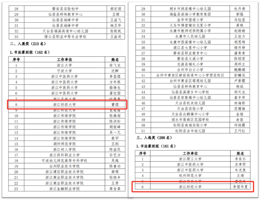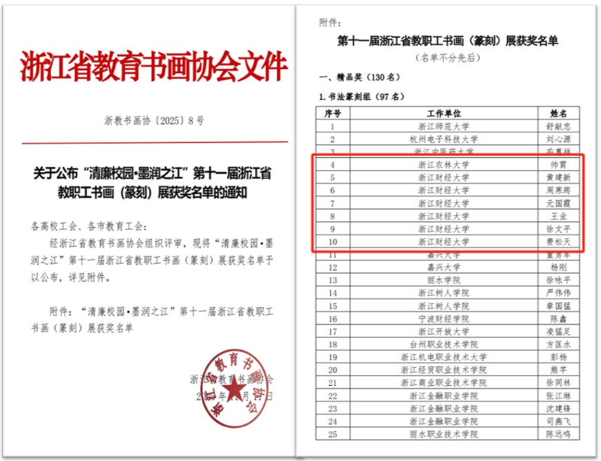 本网讯 12月16日,“清廉校园 墨润之江”浙江省教育系统书画(篆刻)展在杭州开幕。本次展览由浙江省教育工会、省教育厅机关党委联合主办。我校黄建新、徐文平、元国霞、王业、周寒筠、李煜华夏、曹煜、费松平等八位教师的作品成功入选展览,其中六位获“精品奖”,一位获“入展奖”,一位获“入选奖”,学校获“优秀组织奖”。