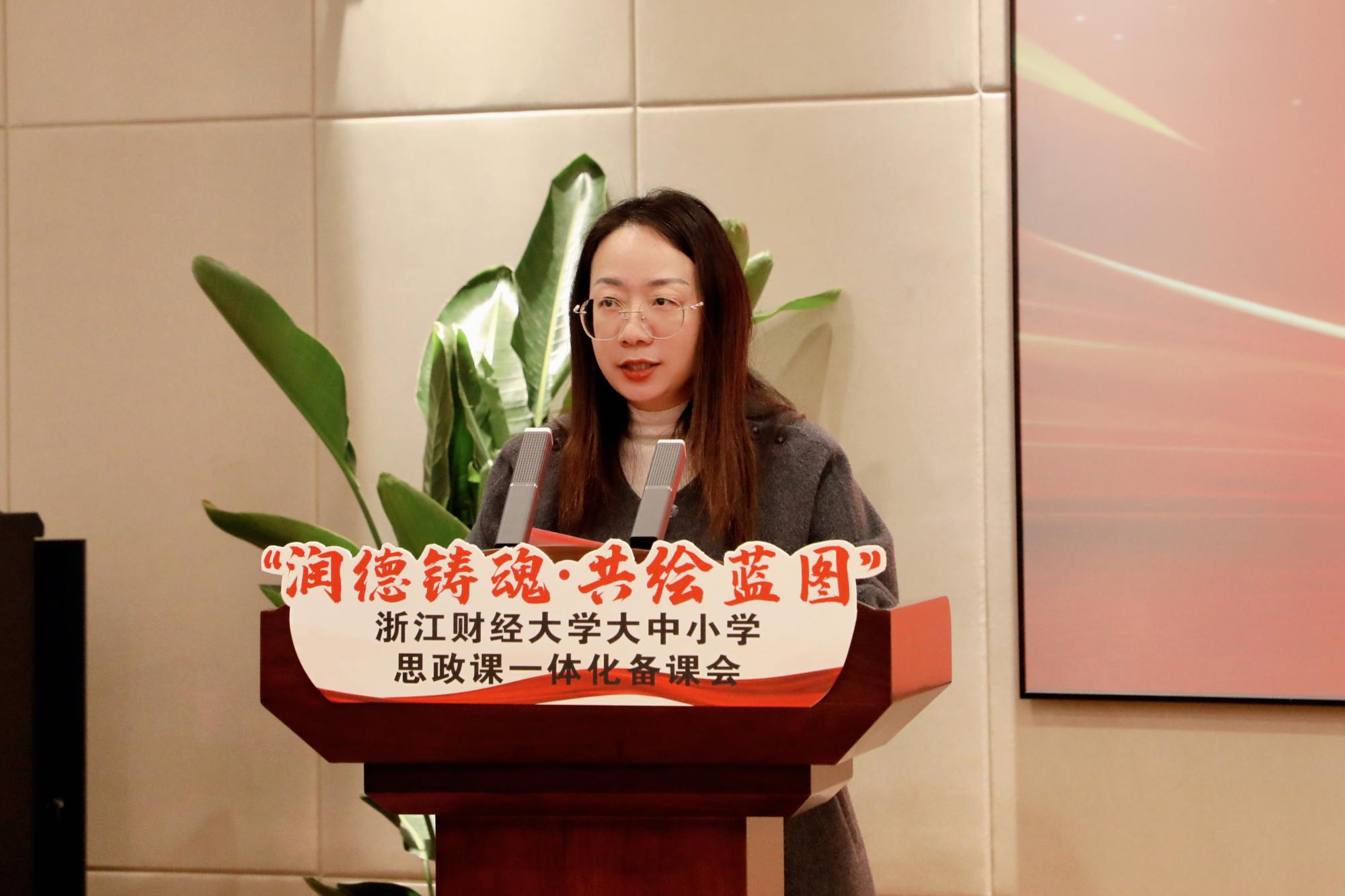 俞婷在致辞中对活动的举办给予高度评价。她表示,浙江省作为全国立德树人机制综合改革试点地区,在大中小学思政课一体化建设方面成效显著,并对浙江财经大学在开展立德树人机制综合改革试点和推进大中小学思政一体化方面的探索实践表示充分肯定。结合当前思政教育面临的新形势新要求,她围绕深化、强化、转化三个关键词提出三点要求:一是要坚持不懈深化立德树人机制改革。聚焦党的创新理论“三进”,统筹课内课外、线上线下育人资源,打造一批富有浙江味、青春味、财经味的思政金课。二是要与时俱进强化思政实践育人。加大力度挖掘实践育人新资源,加快进度打造实践思政新范式。用好我省思政课实践地图,有主题地开展行走的思政课系列活动,组织学生寻迹溯源实践教学,追寻领袖足迹,感悟思想伟力。三要知行合一转化思政教育实效。聚焦教育强省建设中的重点难点,瞄准学生发展成长的痛点堵点,大中小学协同配合、精准发力,推动思政教育与解决实际问题相结合,让育人工作更有温度、力度与深度。