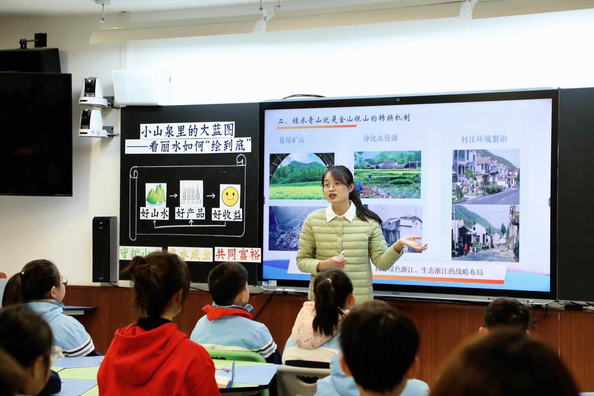 范红儿老师以“身边的矿泉水”为切入点,通过情景模拟、小组合作等形式,引导小学生化身“丽水山泉规划师”,围绕“开发还是保护”展开辩论。她通过“好山水—好产品—好收益— 反哺山水”的闭环逻辑,让学生直观理解“一张蓝图绘到底”的深刻内涵。