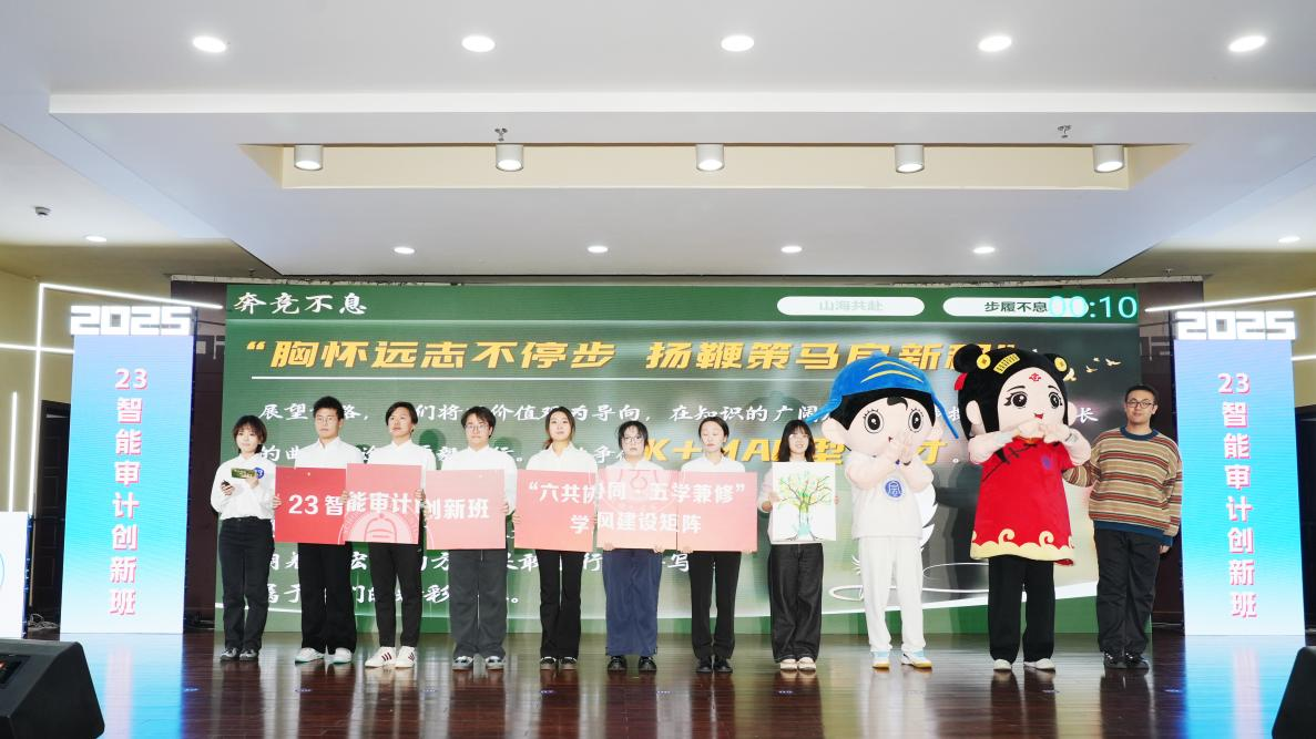 23智能审计创新班以“六共协同”践行“五学兼修”,构筑知行合一的成长生态:共筑“学途指南”信息站,建立同步课程群33个,共享“学霸笔记”资源库,班级成员参与率100%,月均下载量超1000次;英语四级通过率100%,六级通过率93%,60%同学平均绩点达4.0以上,奖学金覆盖率达53%,创赛参与率100%,斩获中国国际大学生创新创业大赛铜奖等国家级奖项16项,省级奖项30余项,校级奖项50余项,国创立项8项,新苗立项6项,把竞赛、科研、证书转化为一张张“智能审计”金名片。