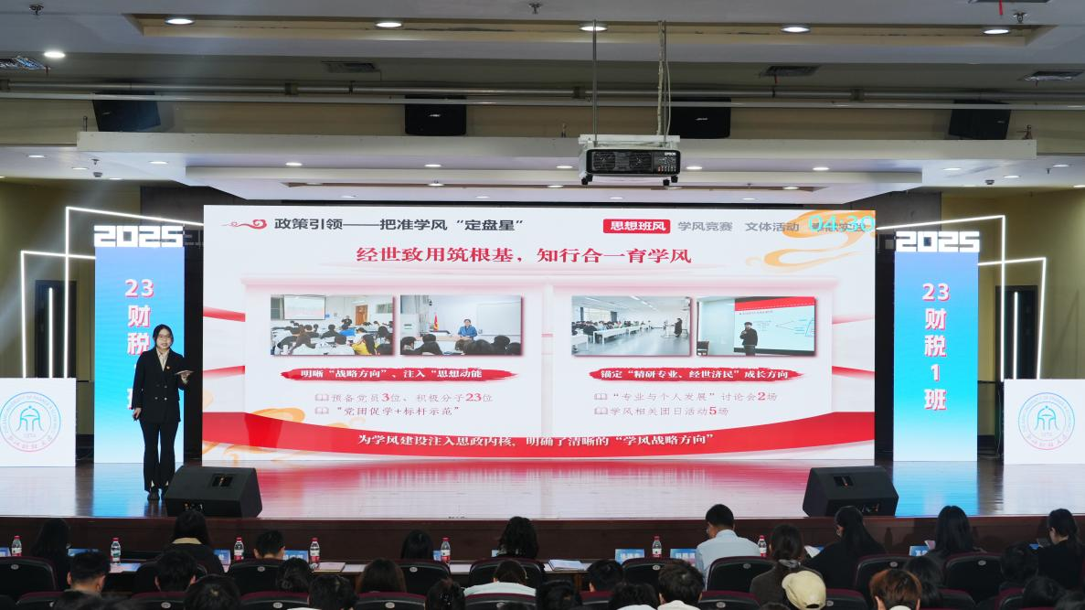 经过班级申报、学院推荐和专家初审,来自全校各学院的16个优秀班级入围现场评审环节。16个候选班级依次登台,通过PPT展示与现场演讲相结合的形式,在6分钟内全面展现班级学风建设的特色与成效。