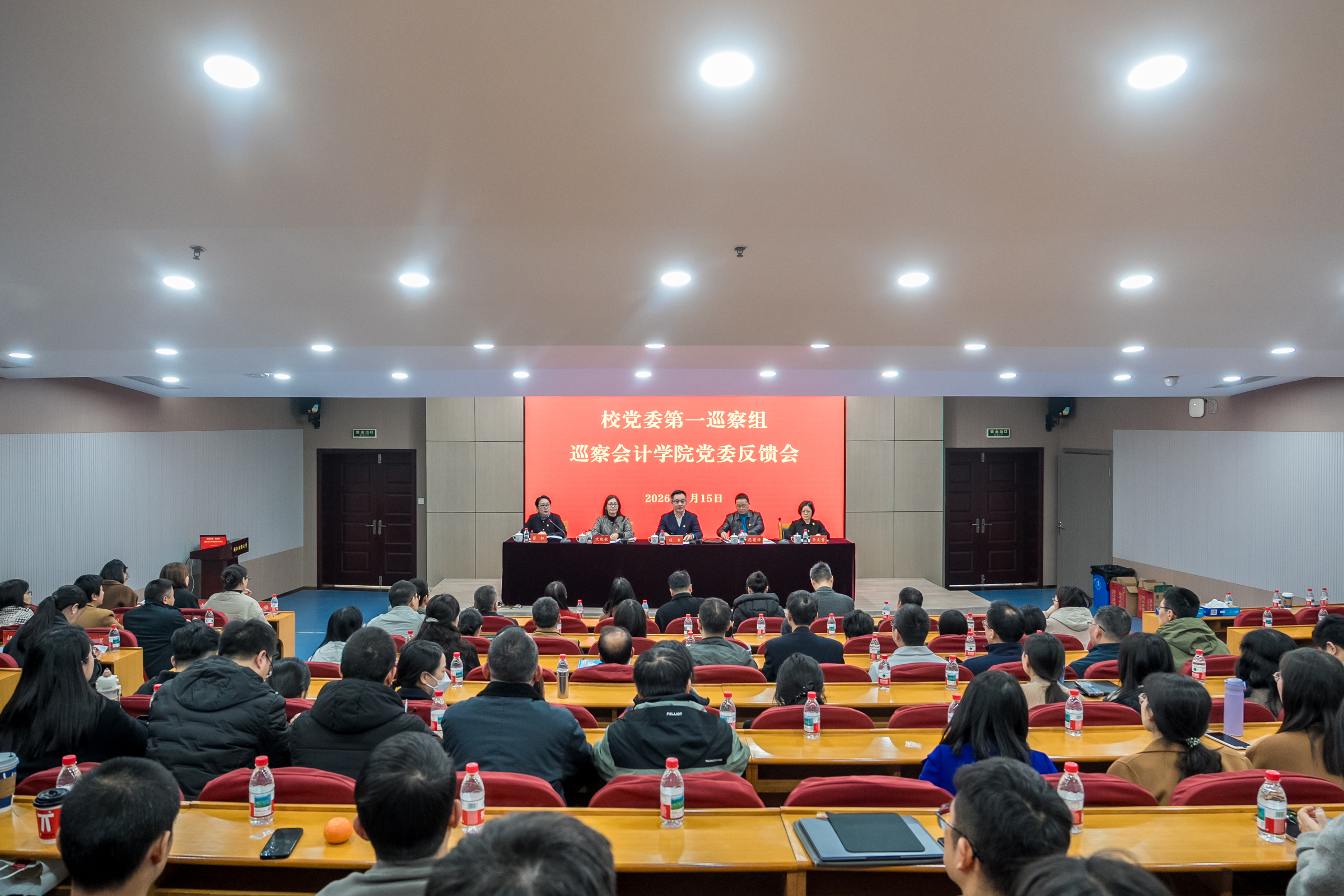 会计学院、图书馆全体教职工及上次巡察以来调离或退出领导岗位的原班子成员,组织部、宣传部、学工部、资产处负责人,巡察组及巡察办全体成员参加会议。