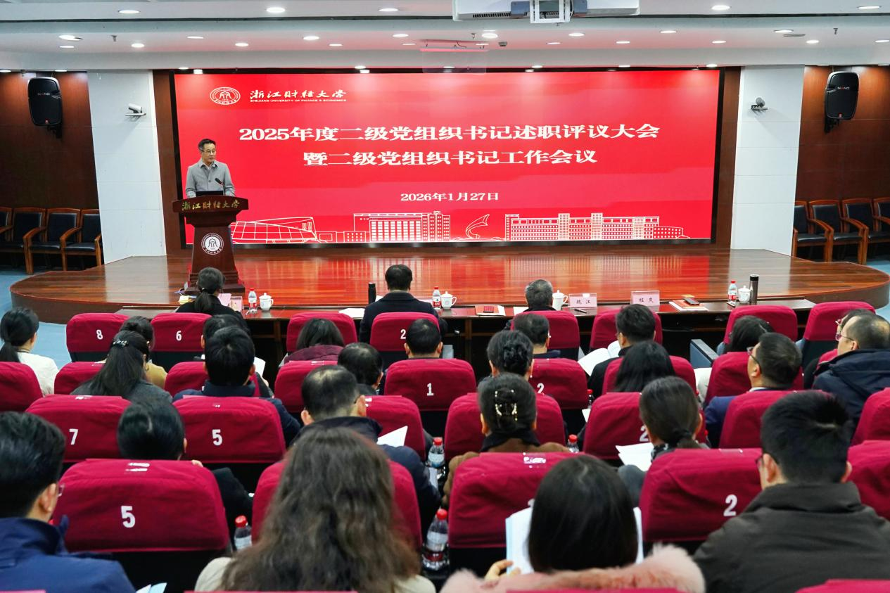 会上,22名二级党组织书记依次进行现场述职,全面汇报年度工作实绩,深入查摆存在问题,明确下一步改进举措。魏江结合日常工作情况和现场述职内容,对各单位逐一进行点评,既肯定了过去一年各二级党组织在党建引领思想政治建设、教育教学改革、科研攻坚、学科发展等方面取得的成效与特色,也指出了存在的问题与不足,并就2026年学校重点工作的推进落实提出四点明确要求:一要紧扣党的建设与事业发展深度融合工作主线,党政同向发力、系统谋划、扎实推进,以“抓铁有痕、踏石留印”的韧劲切实破解党建与业务“两张皮”现象;二要聚焦教学科研与育人生态创新,谋定实施“十五五”规划,扎实推进使命文化年建设,持续深化“三风”建设,营造严实教风、优良学风和清正育人作风,提升人才培养质量;三要深入开展党的创新理论体系化、学理化研究阐释,推动习近平新时代中国特色社会主义思想进教材、进课堂、进头脑;四要守底线、攀高线,秉持改革精神、创新意识、团结作风、奋斗姿态,奋力建设鲜明新财经特色的一流研究教学型大学。
