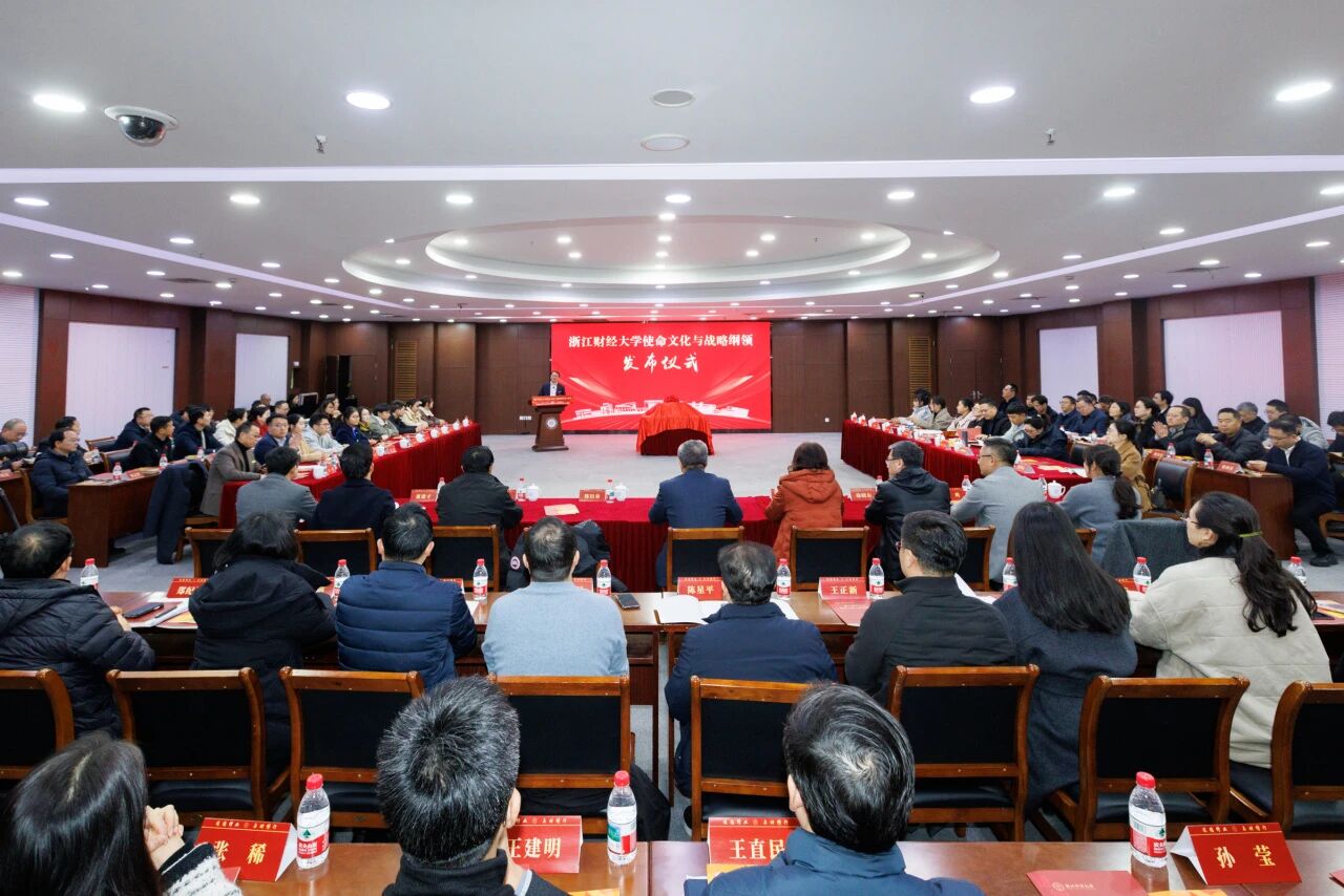 本网讯 岁律更新,文脉无穷。1月29日,浙江财经大学学术中心多功能厅灯光璀璨、暖意融融,《浙江财经大学使命文化与战略纲领》(以下简称《纲领》)发布会隆重举行。魏江、陈衍泰、郑亚莉、李占荣、徐晓东、董进才、程爽、何贤杰、申屠莉等全体校领导班子成员,新华社、浙江日报、澎湃新闻、中国教育在线、杭州网等媒体记者到场见证,中层干部、师生代表、校友代表两百余人齐聚一堂,共同迎来这一载入校史的重要时刻。会议由校长、党委副书记陈衍泰主持。