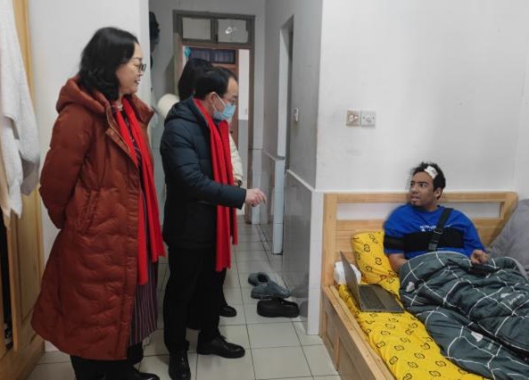 随后,郑亚莉走进学生宿舍,探望了因伤行动不便的留学生,关切地询问其伤势恢复情况,嘱咐他安心养伤,并祝愿他早日康复,度过一个平安愉快的春节假期。