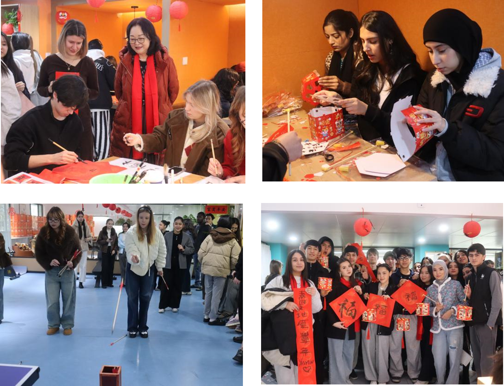 “和合之家”内张灯结彩,暖意融融。来自世界各地的同学们铺纸研墨,提笔书写寓意吉祥的春联和“福”字;巧手翻飞,细心剪出精美的窗花;制作充满喜庆气息的手工灯笼;墨香纸暖间,欢声笑语不断,方寸之间流淌着浓浓的年味。运动空间里踢毽子、投壶等传统趣味活动正热烈进行,同学们在尝试与互动中感受着中国传统游戏的乐趣,加油声、喝彩声此起彼伏。
