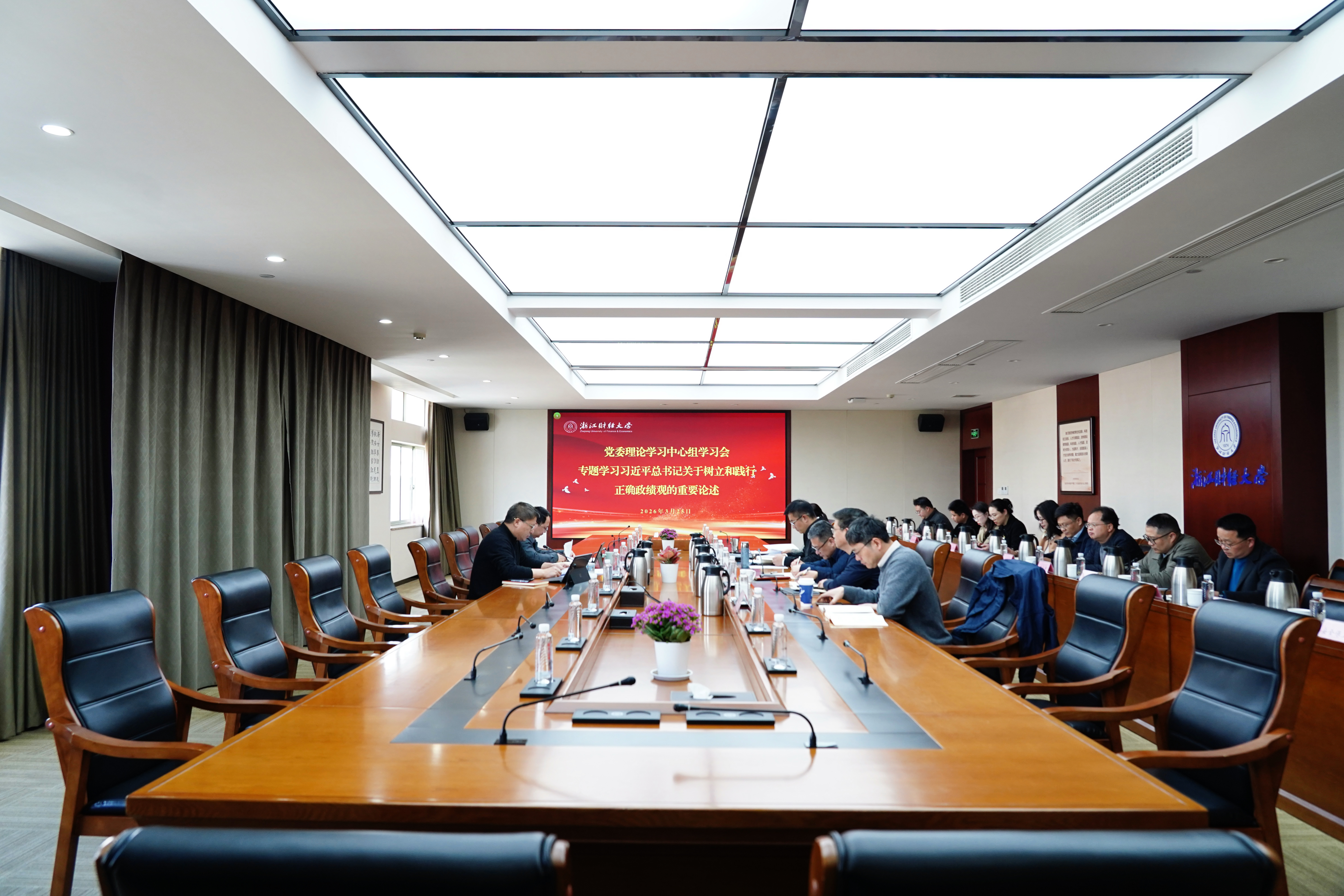 本网讯 3月25日,学校召开党委理论学习中心组学习会,深入学习贯彻习近平总书记关于树立和践行正确政绩观的重要论述,围绕“树立和践行正确政绩观”开展集中学习研讨。校党委书记魏江主持会议并讲话,校长、党委副书记陈衍泰,党委副书记程爽作交流发言,校党委理论学习中心组成员参加会议。党群部门负责人列席会议。