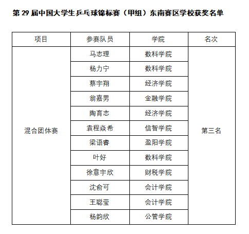本网讯 11月14日至16日,第29届中国大学生乒乓球锦标赛(甲组)东南赛区在绍兴新昌举行。学校运动健儿奋勇拼搏,勇夺混合团体赛季军,并获全国总决赛的参赛资格,数科学院叶好同学荣获“优秀运动员”称号。