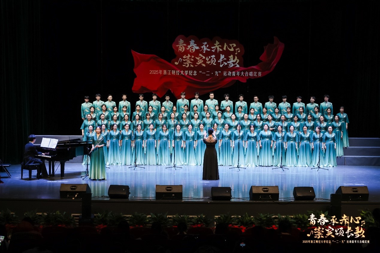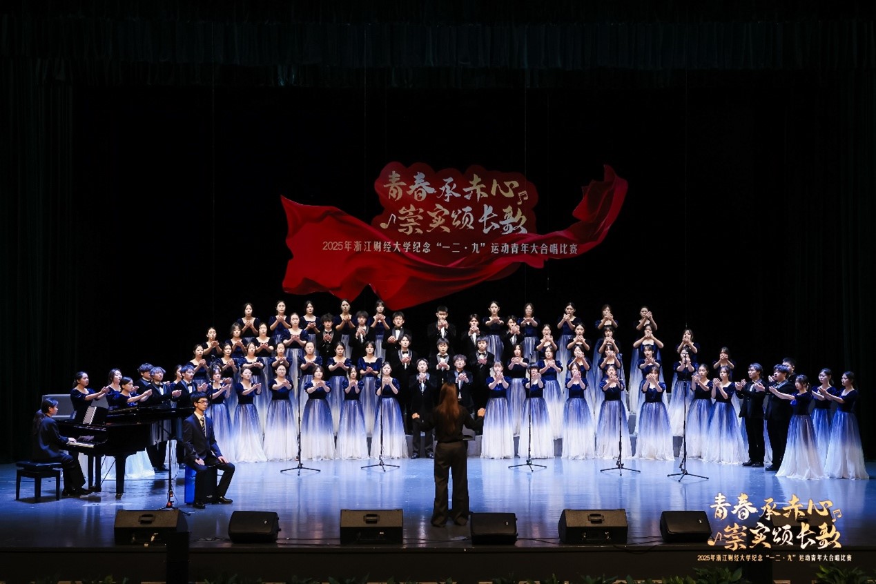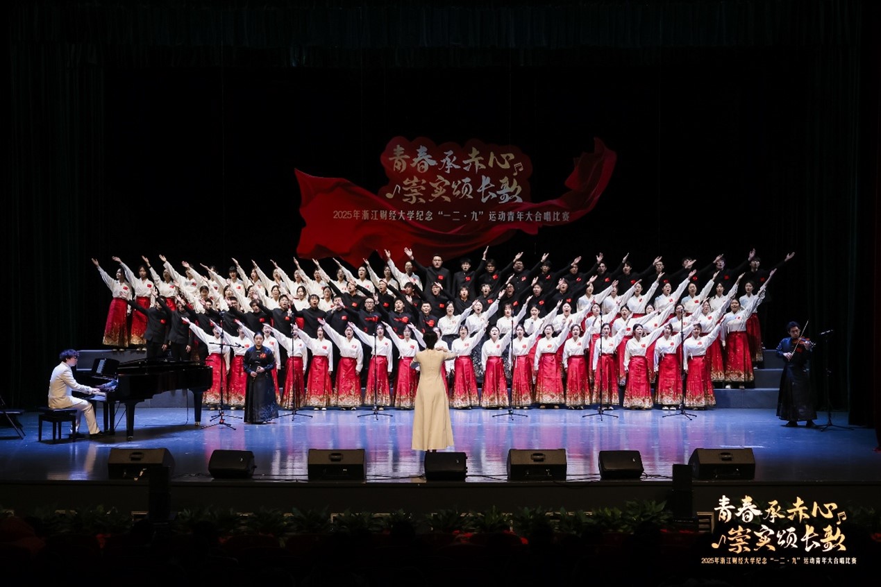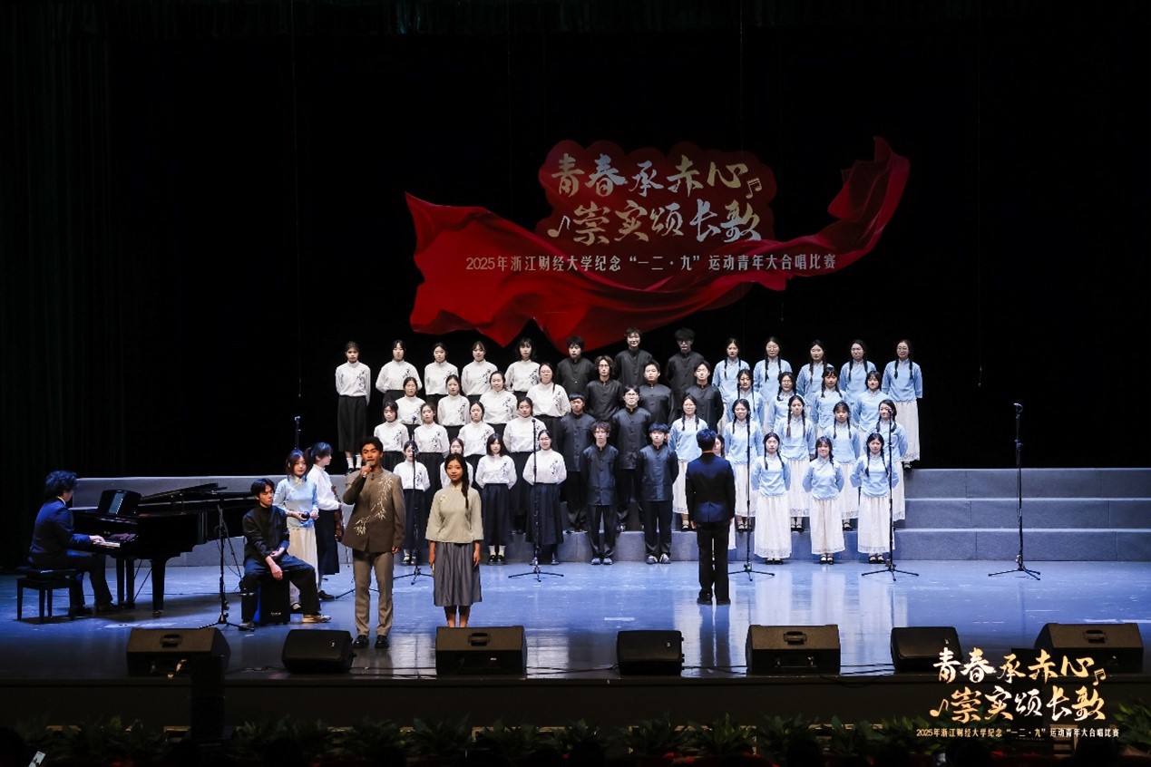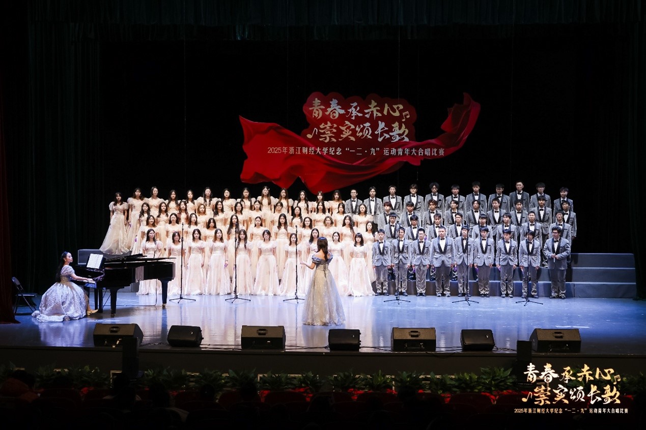 本网讯 为纪念“一二·九”运动九十周年,进一步传承和弘扬爱国主义精神,展现新时代青年的良好风貌,12月9日,2025年浙江财经大学纪念“一二·九”运动青年大合唱比赛在普华大剧院举行。专家评委、校团委负责人、各二级学院团委书记以及1000余名师生代表参加了本次活动。