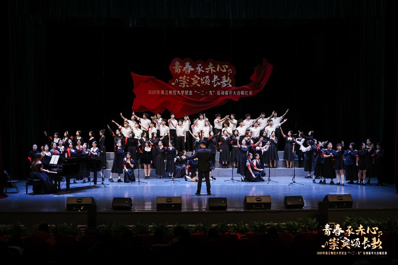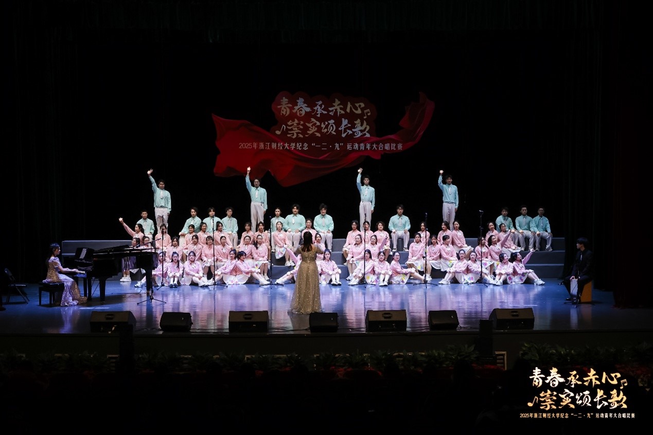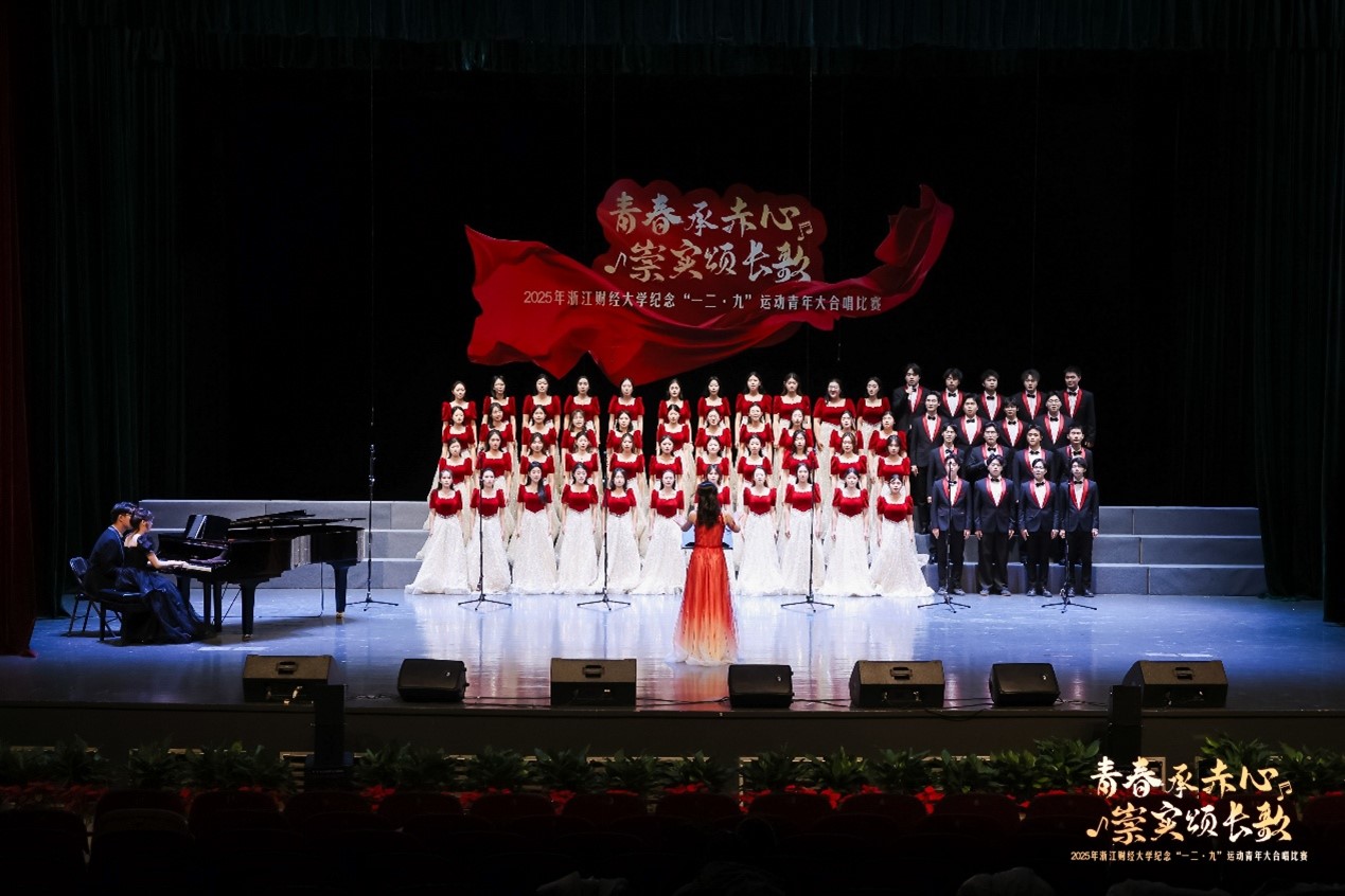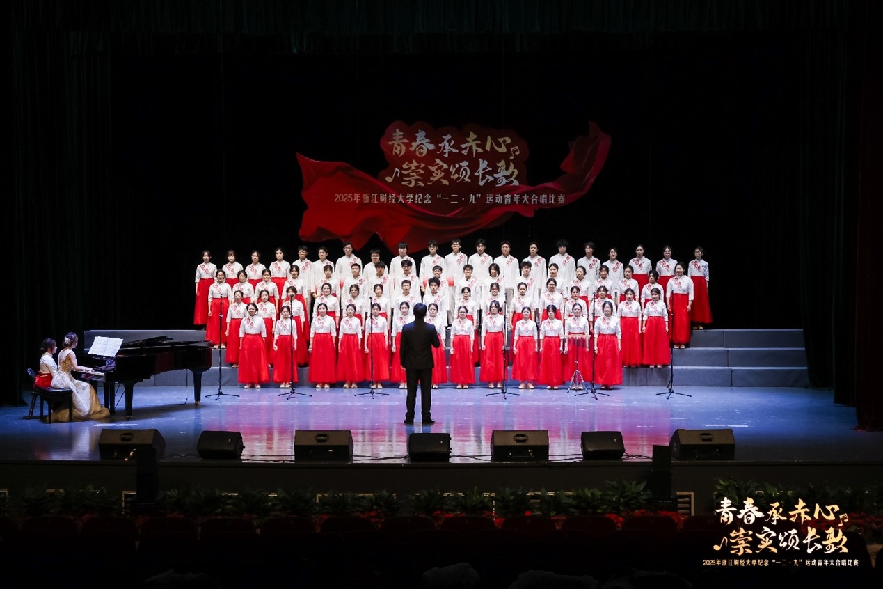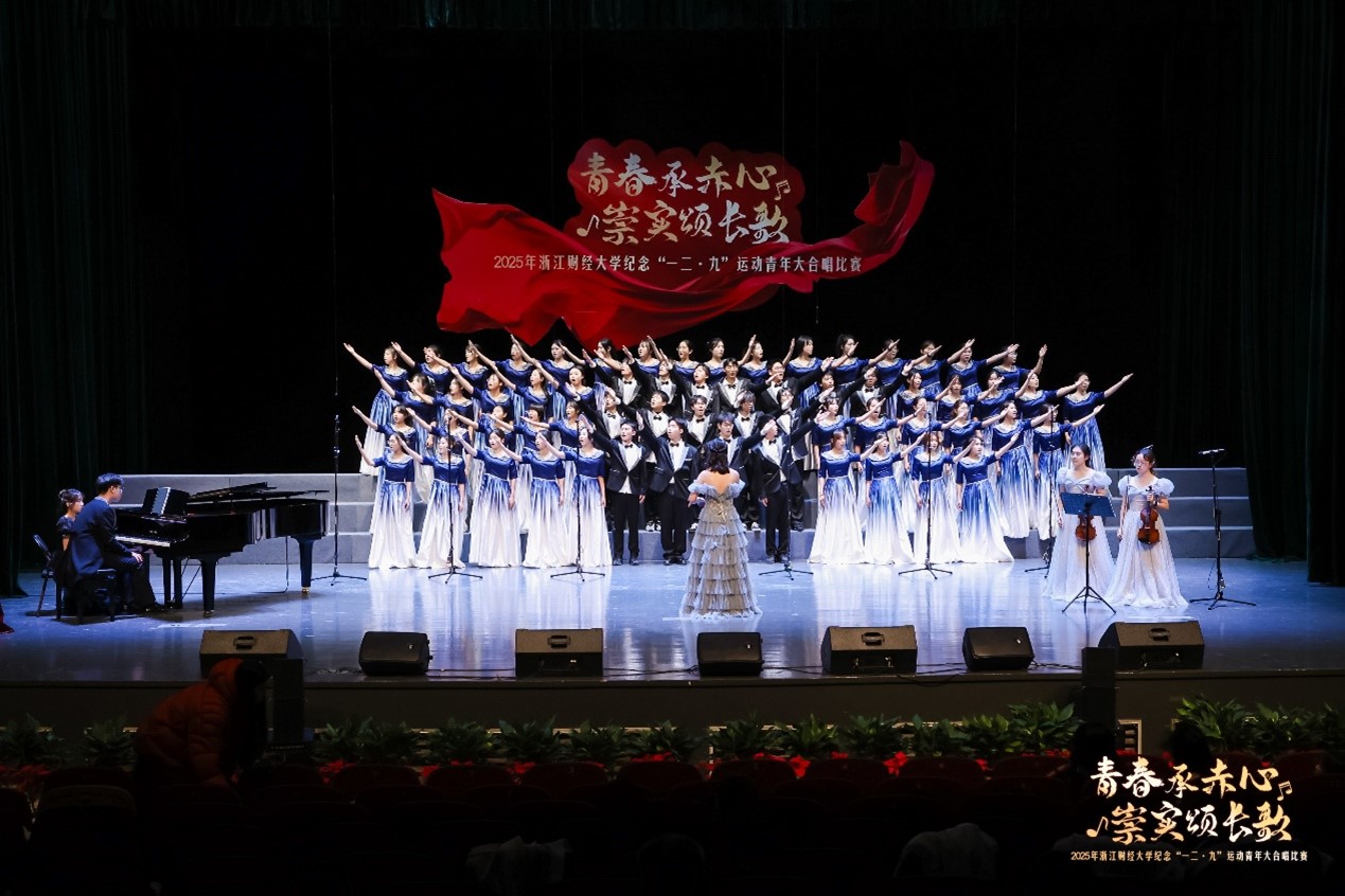 本网讯 为纪念“一二·九”运动九十周年,进一步传承和弘扬爱国主义精神,展现新时代青年的良好风貌,12月9日,2025年浙江财经大学纪念“一二·九”运动青年大合唱比赛在普华大剧院举行。专家评委、校团委负责人、各二级学院团委书记以及1000余名师生代表参加了本次活动。