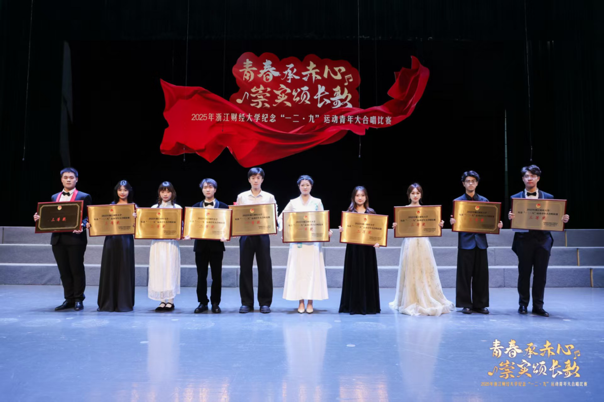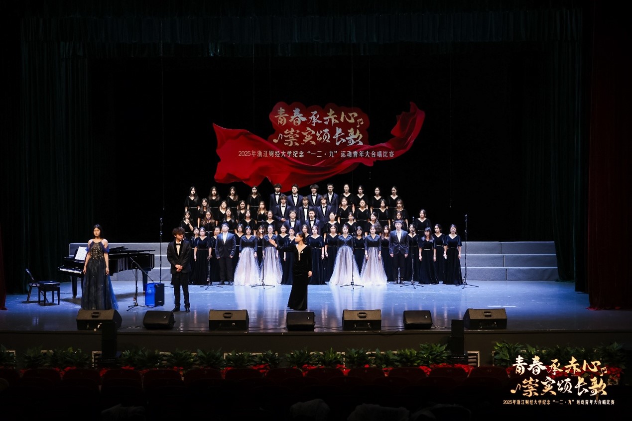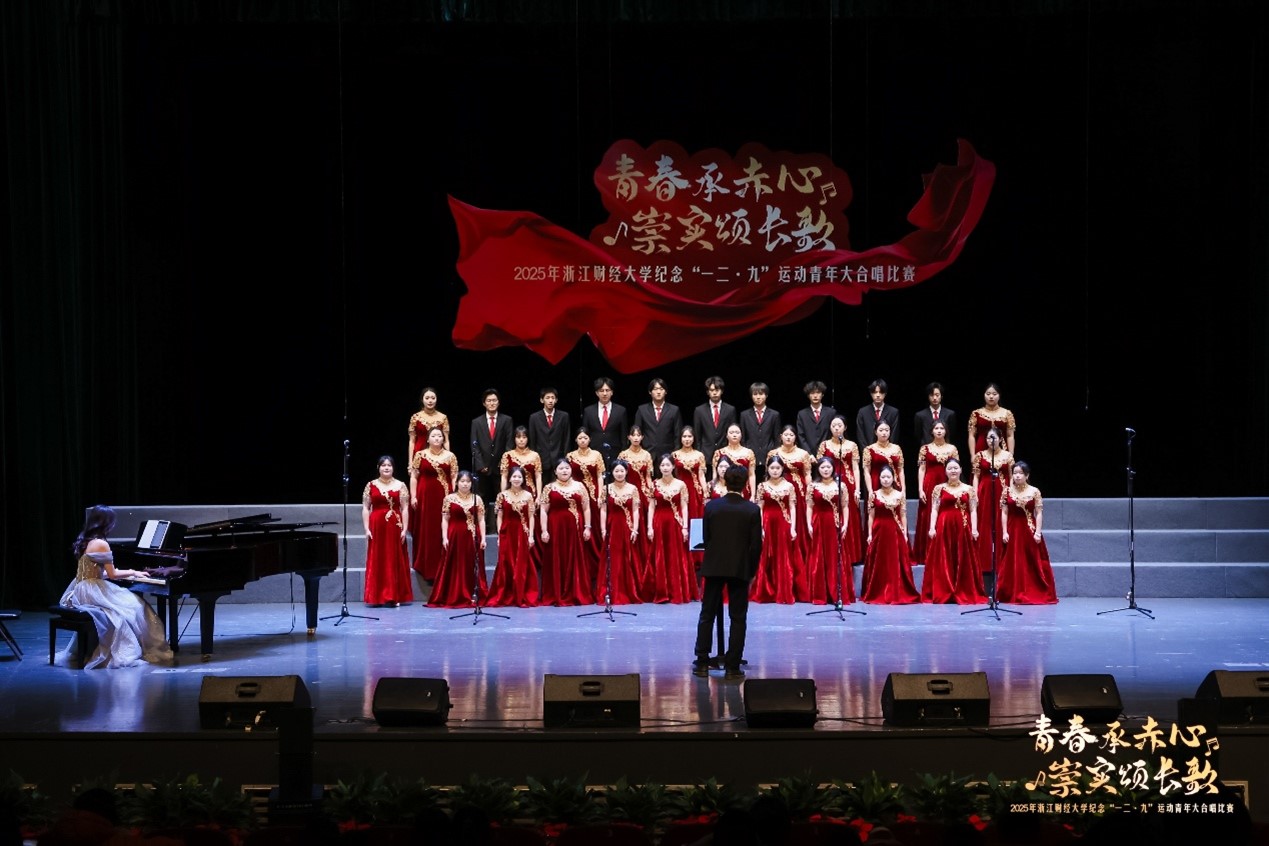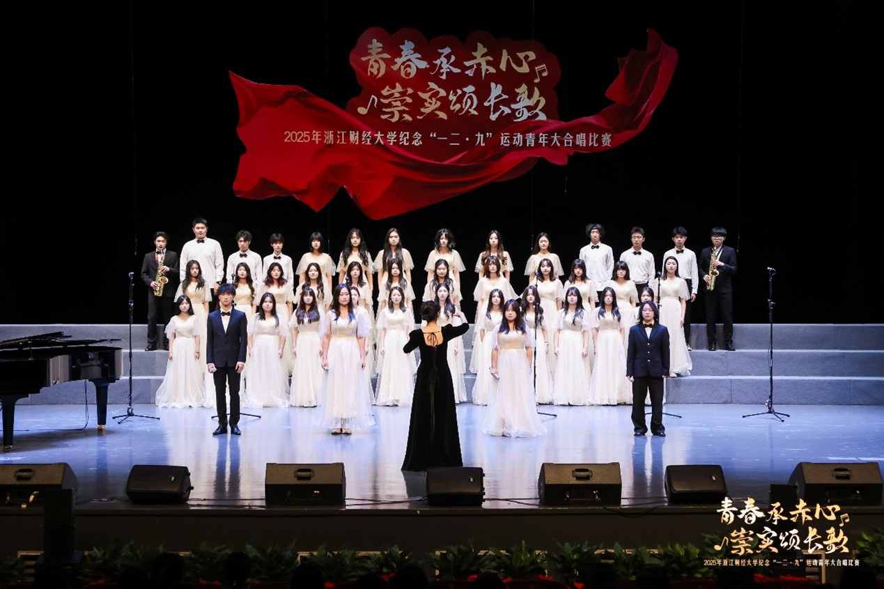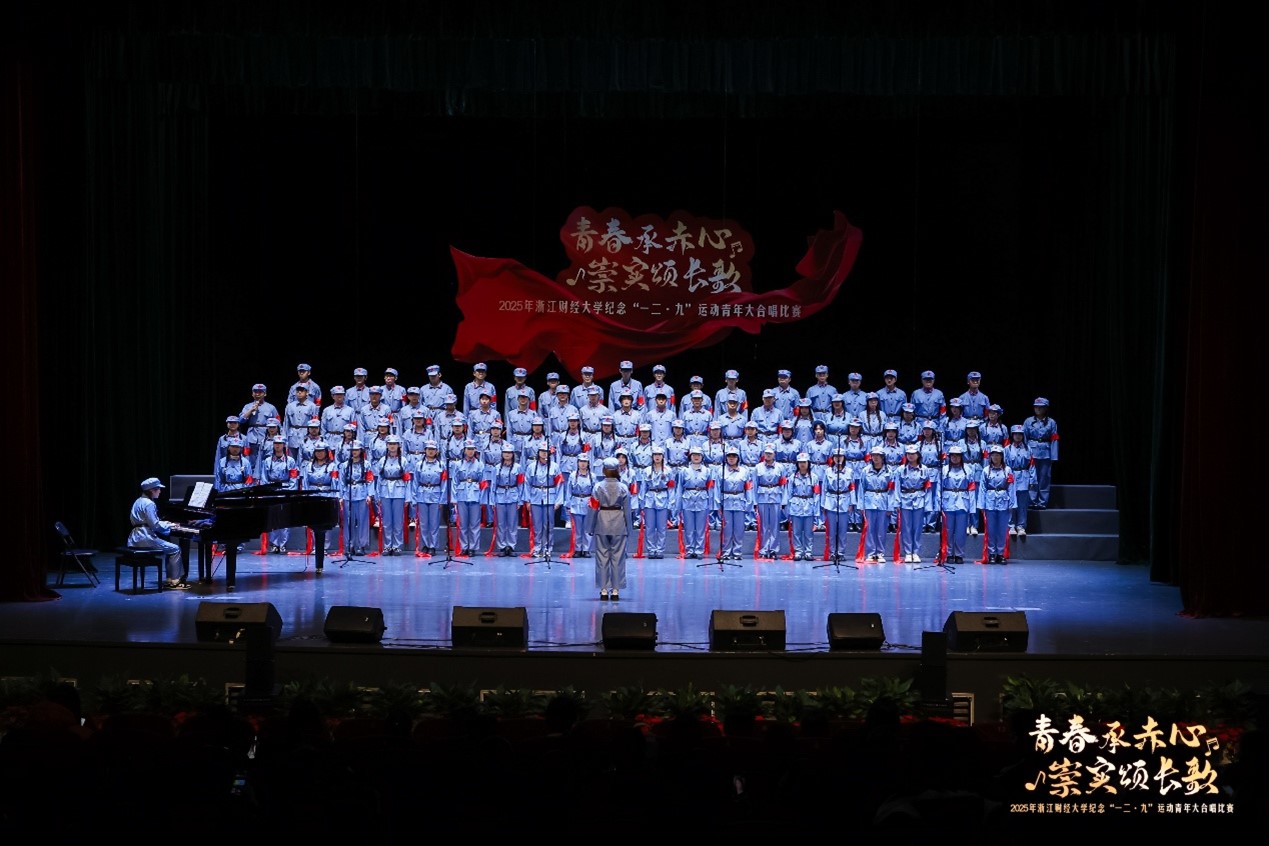 本网讯 为纪念“一二·九”运动九十周年,进一步传承和弘扬爱国主义精神,展现新时代青年的良好风貌,12月9日,2025年浙江财经大学纪念“一二·九”运动青年大合唱比赛在普华大剧院举行。专家评委、校团委负责人、各二级学院团委书记以及1000余名师生代表参加了本次活动。