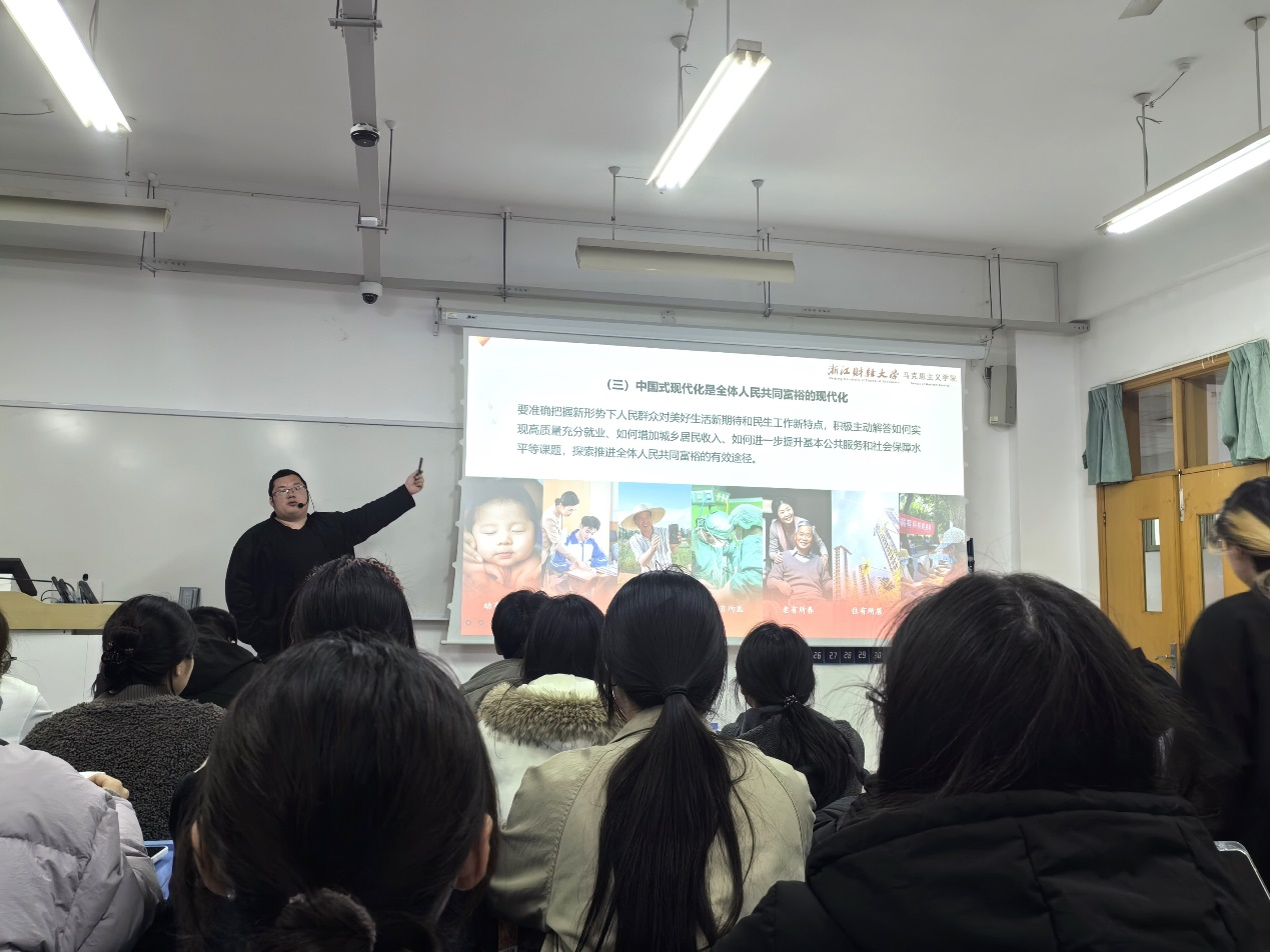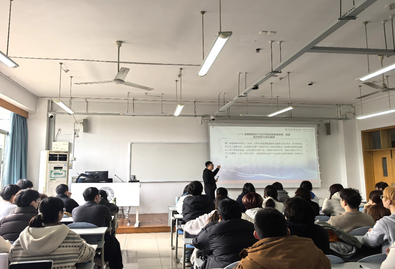 在《形势与政策》课堂上,青年教师周永昇结合两会期间习近平总书记在参加江苏代表团审议时的重要讲话精神,与学生就实体经济在发展新质生产力中的作用展开讨论。周永昇老师在与学生互动中提到,发展新质生产力的核心在于创新,关键在于一体推进教育科技人才发展,但落脚点始终是实体经济,实体经济是推动制造业高端化、智能化、绿色化转型的主战场。学生们也充分表达了自己的感受与看法,认为作为新时代青年,应夯实专业基础,积极投身智能制造、数字经济等前沿领域,为浙江实体经济高质量发展贡献智慧与力量。