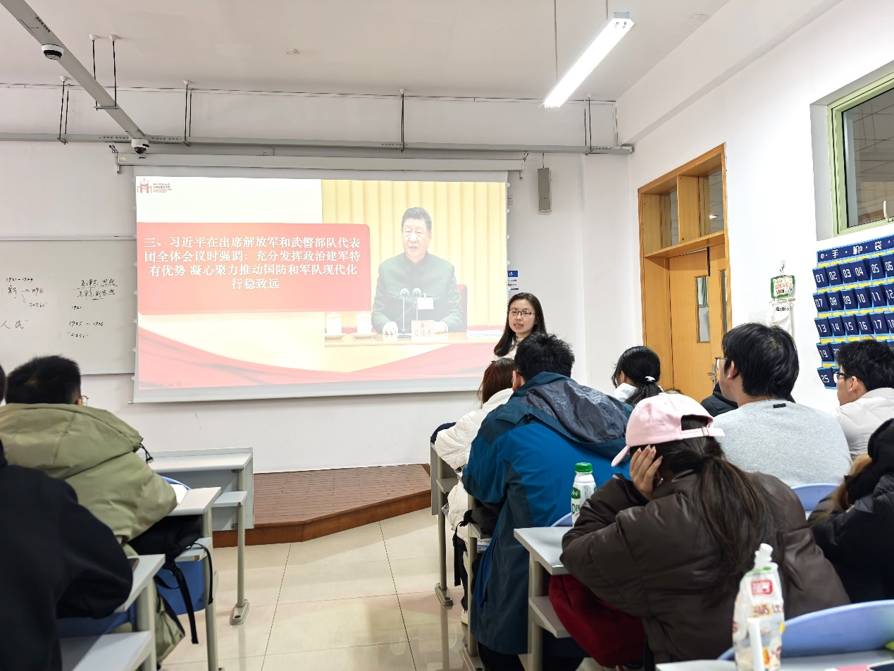 在《毛泽东思想和中国特色社会主义理论体系概论》课堂上,青年教师薛灵美将习近平主席关于“充分发挥政治建军特有优势”的重要论述与毛泽东军事思想核心“党指挥枪”有机结合起来,向学生深刻展示了从“三湾改编”确立“支部建在连上”到新时代强军兴军的伟大实践。这种贯通时空的理论与历史交融,让学生清晰地洞察到国家在坚持政治建军、确保“强军之魂”永不变色方面所具有的独特政治优势,不仅帮助学生加深了对两会精神的理解,更进一步明晰了自身在推动国防和军队现代化进程中应当肩负的时代责任与历史使命。
