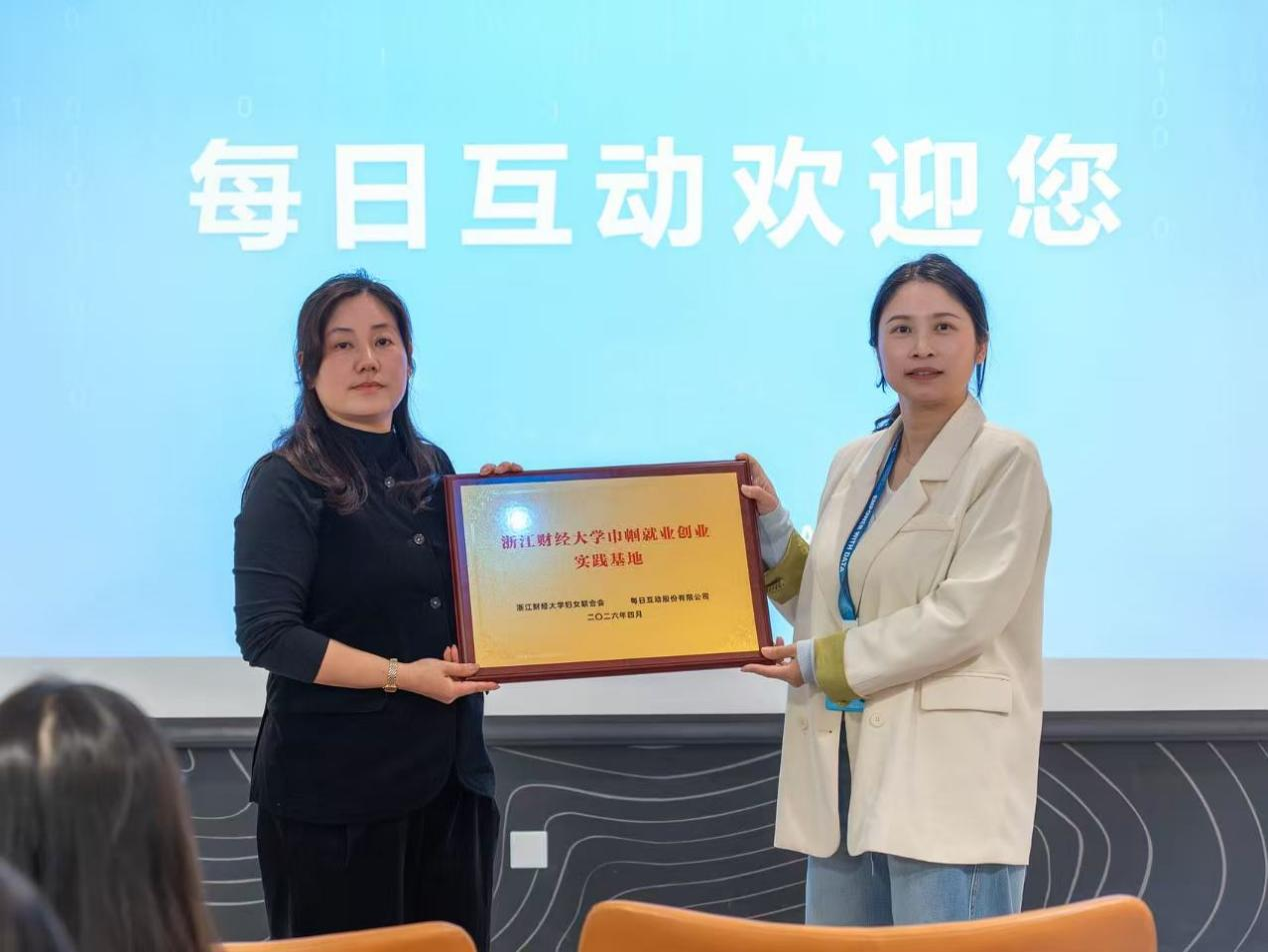 授牌环节,申屠莉代表校妇联向每日互动授予“巾帼就业创业实践基地”牌匾,并为张洁颁发“巾帼就业创业导师”聘书。她表示,校企合作不是单向输送,而是双向赋能、彼此成就。希望通过此次走访,建立更深度的链接与合作,把课堂延伸到数字产业一线,把论文写在智能场景之中,让企业的真实需求反哺教学改革,共同定义未来人才的成长坐标。