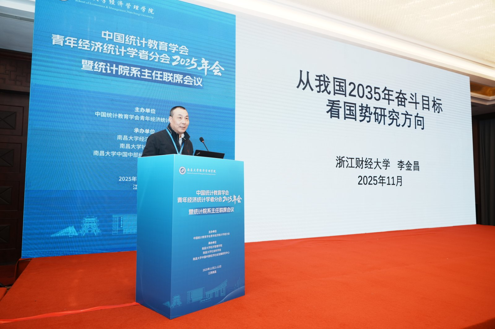 本网讯 11月21-22日,中国统计教育学会青年经济统计学者分会2025年会暨统计院系主任联席会议在南昌大学召开。来自全国90余所高校与科研机构的200余位专家学者齐聚一堂,共同探讨统计学科的前沿发展、跨学科融合与人才培养改革。校发展委员会主席李金昌教授受邀出席大会,并作题为《从我国2035年奋斗目标看国势研究方向》主旨报告。