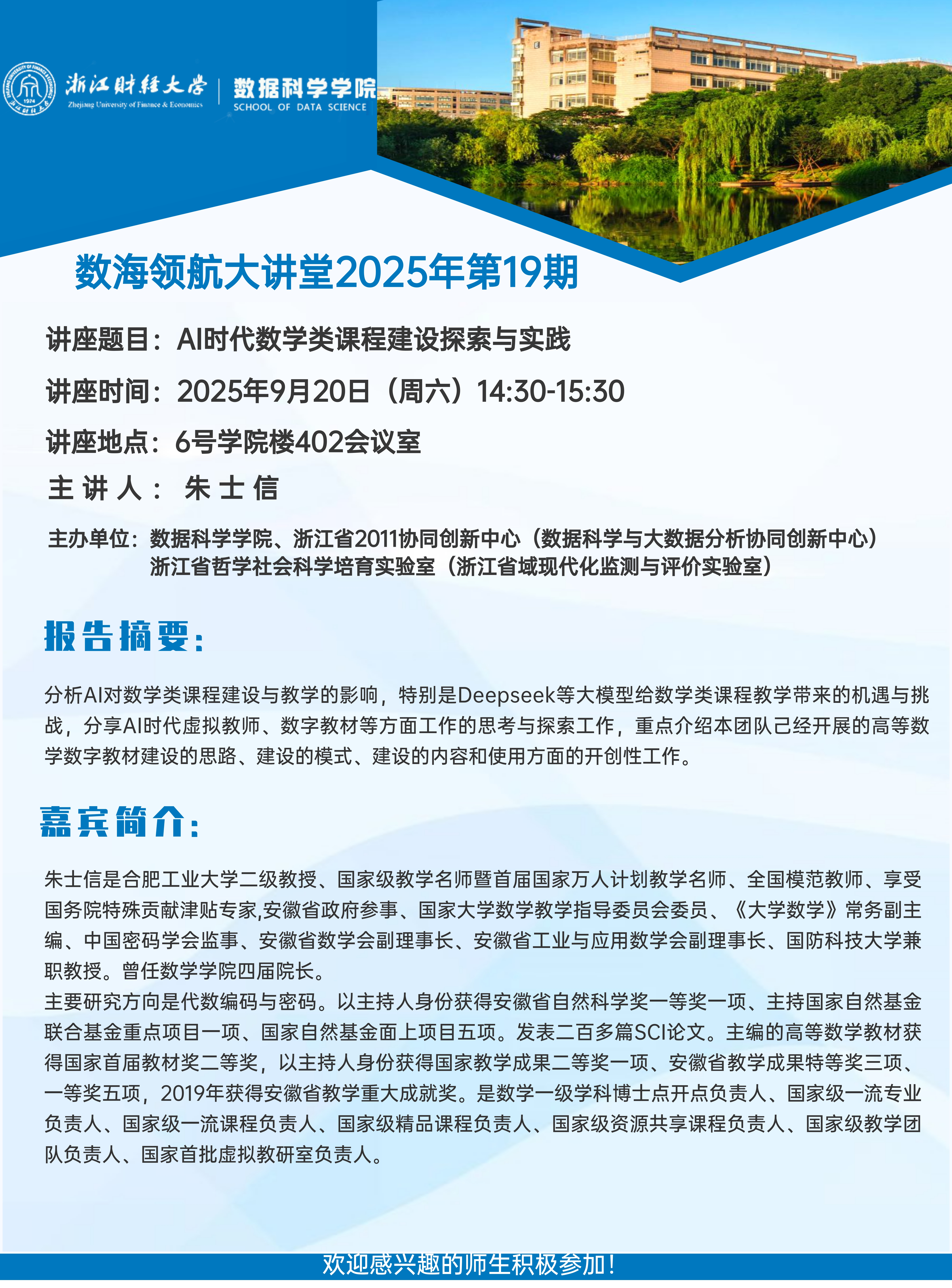 【数据科学学院系列学术活动】“数海领航”大讲堂2025年第19期:AI时代数学类课程建设探索与实践