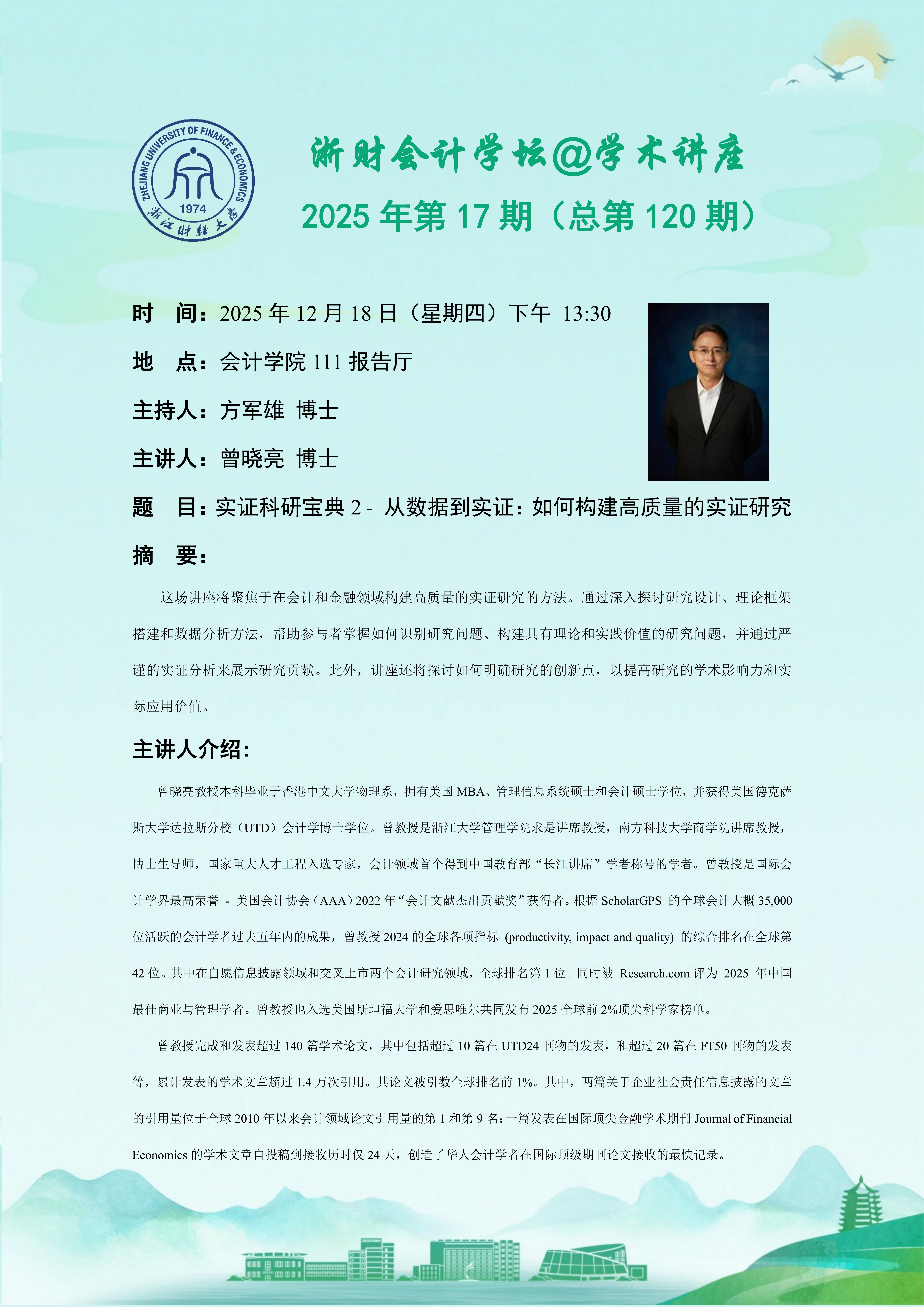 【会计学院系列学术活动】浙财会计学坛@学术讲座2025年第17期(总第120期)——曾晓亮博士