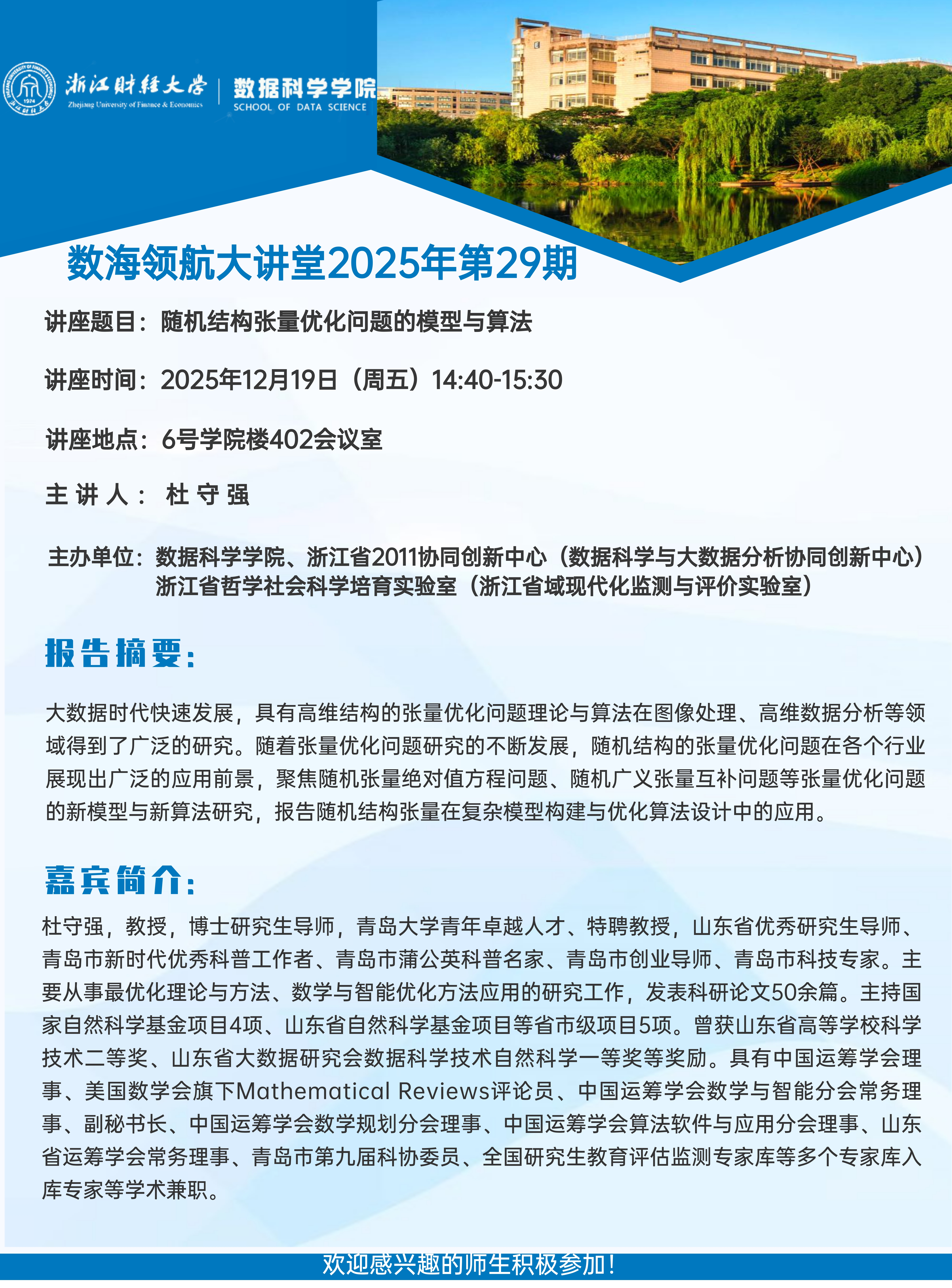【数据科学学院系列学术活动】“数海领航”大讲堂2025年第29期:随机结构张量优化问题的模型与算法