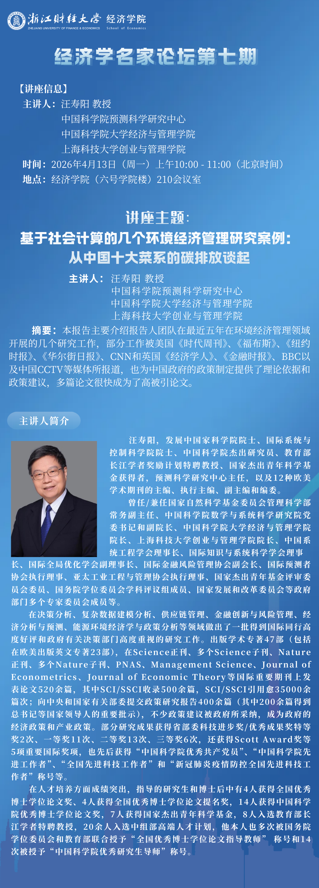 【经济学院系列学术活动】经济学名家论坛第七期:基于社会计算的几个环境经济管理研究案例——从中国十大菜系的碳排放谈起